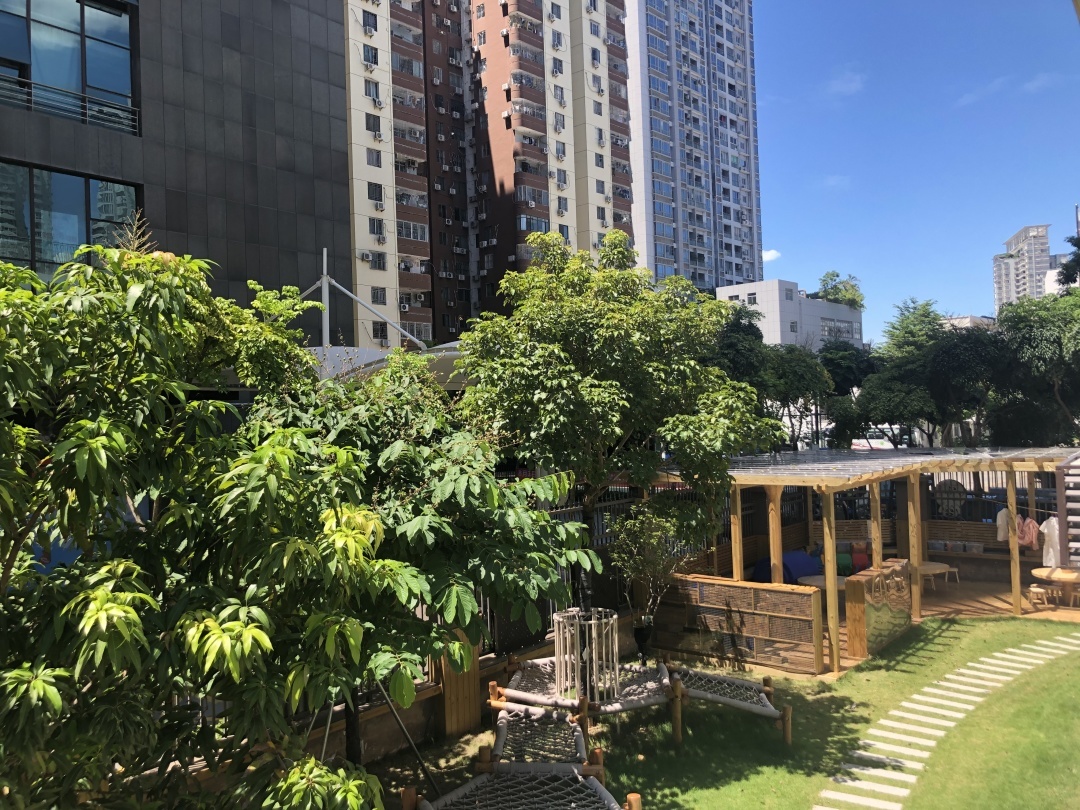 位于深圳南山这个寸土寸金的区域,有一个小小的幼儿园里就拥有了一个好看的庭院,面积虽然不大,但是在有限的空间里也为小朋友们创造了很多玩耍的空间。