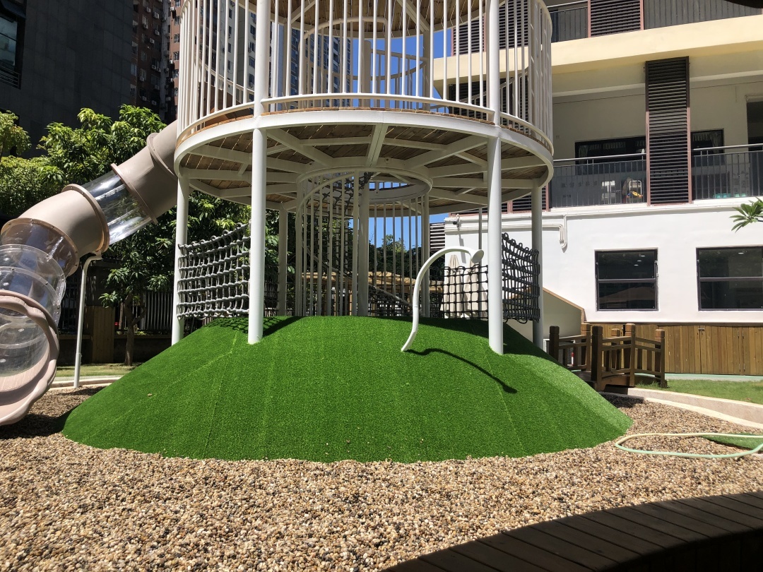 原本平坦的区域通过施工增加土坡,土坡上设置一处双层平台,利用层高架设滑桶、攀爬网等,平台可俯视整个幼儿园户外区域。