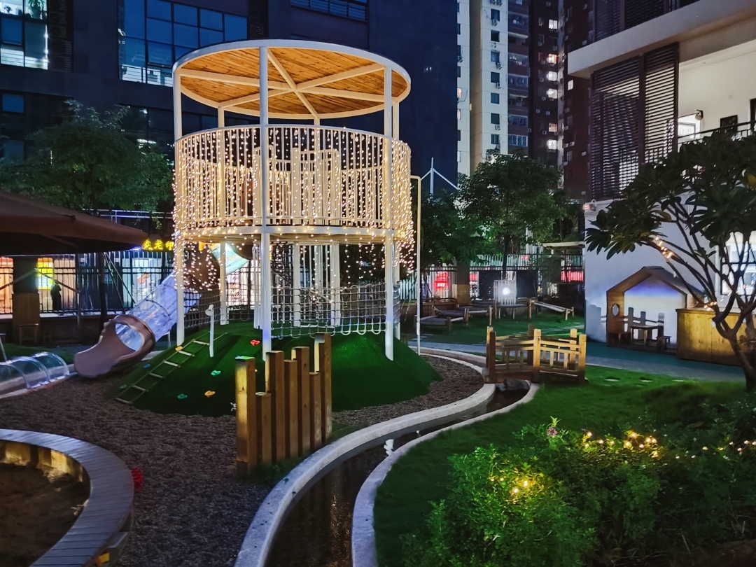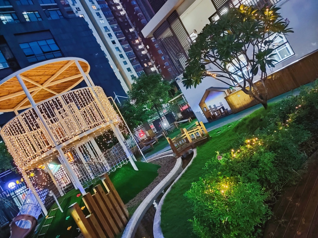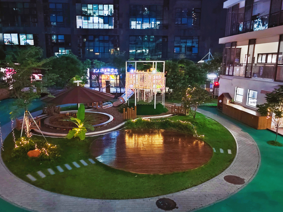 幼儿园的园长和老师为了幼儿园的环境花了许多心思,给庭院中的树和平台增加了许多小型led灯,当夜幕降临时,整个庭院流光溢彩,虽然已经是成年人,但还是会被幼儿园的美景所吸引,看完都想重读一次幼儿园!