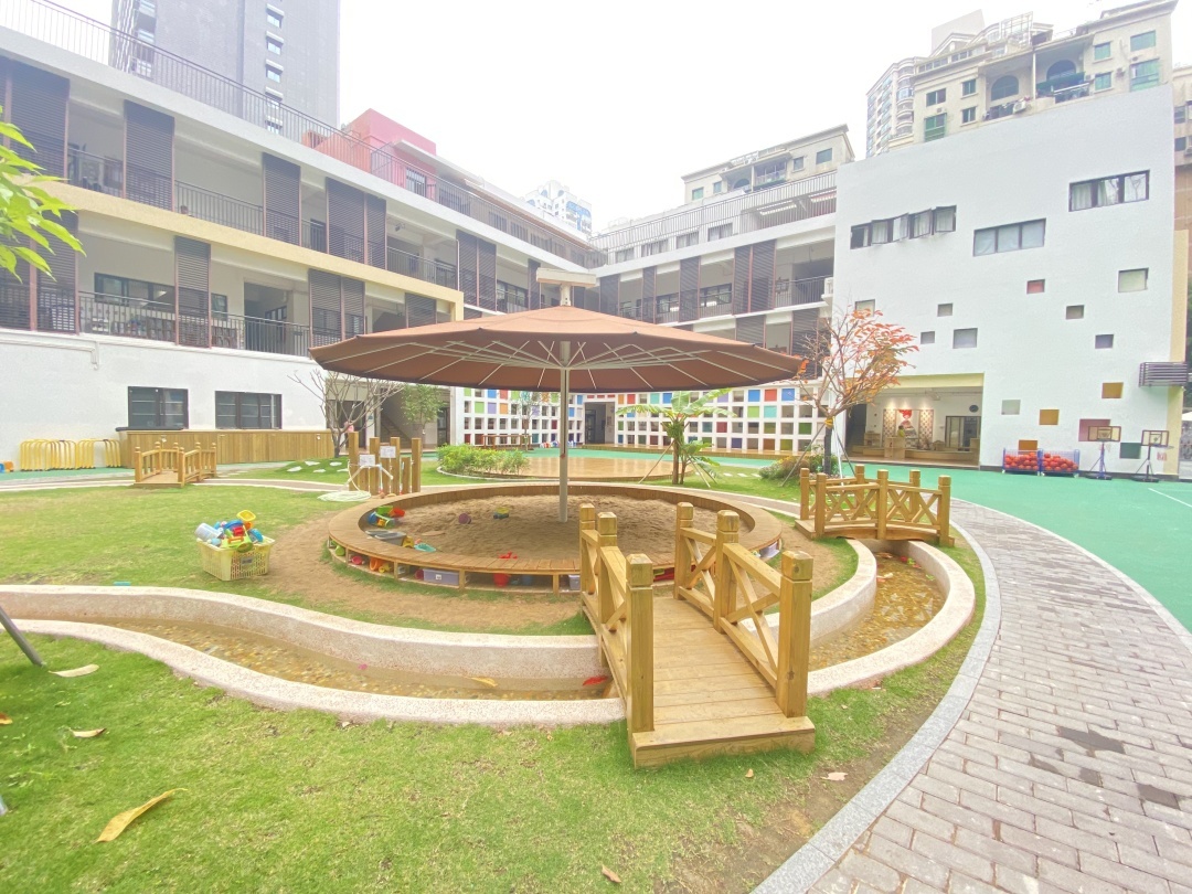 沙水聚集在一块区域,沙池上方是可伸缩遮阳棚,放学后可将整个沙池覆盖,避免了夜间有小动物闯入污染沙池中的沙子。
