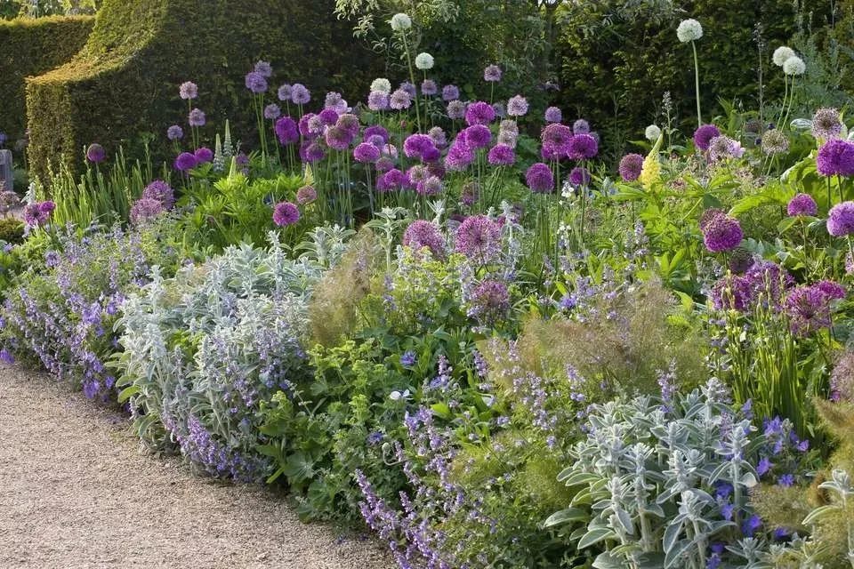 观赏葱最适合布置在花镜的中间,周围有一些其他的植物包围着,就可以看到它那非常圆的大花球,又能遮挡不太好看的叶子。