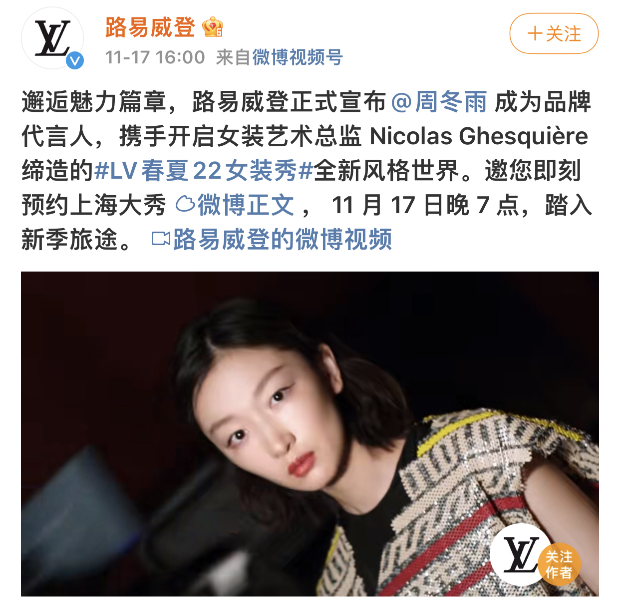 插播一条信息:在LV春夏22女装大秀,“三金影后”周冬雨被正式官宣为LV的品牌代言人,成功解锁蓝血顶奢代言的她,可是LV史上首位中国籍的品牌代言人,LV在大秀上的高调官宣,可谓是给足了排面。
