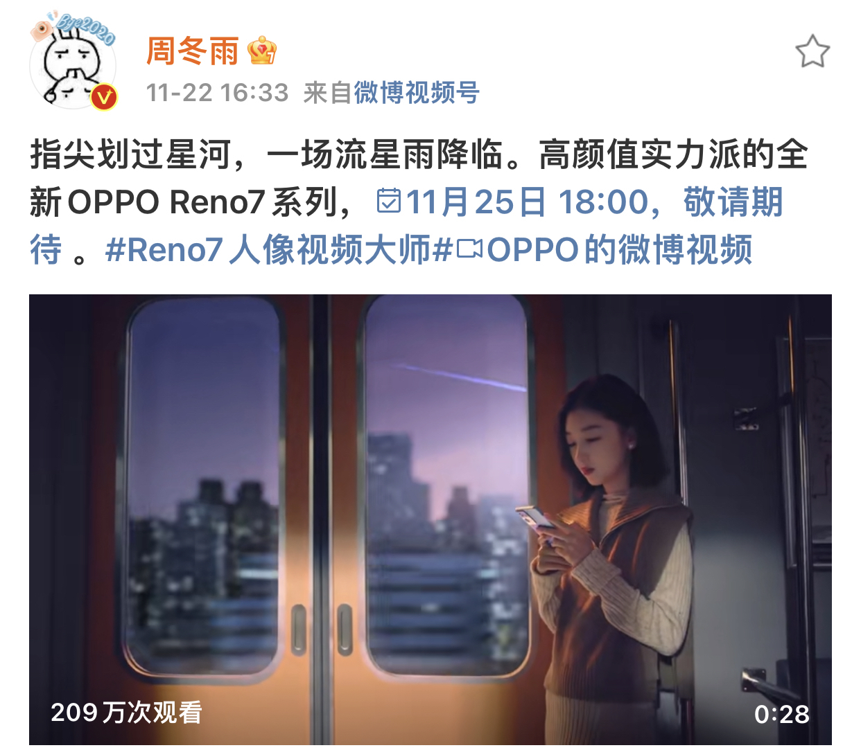 爱上“流星雨”的周冬雨,不仅将“流星雨”穿在身上,更是握在手中——在OPPO的代言上,也将时尚进行到底,为“流星雨”手机OPPO Reno7系列强势打call。