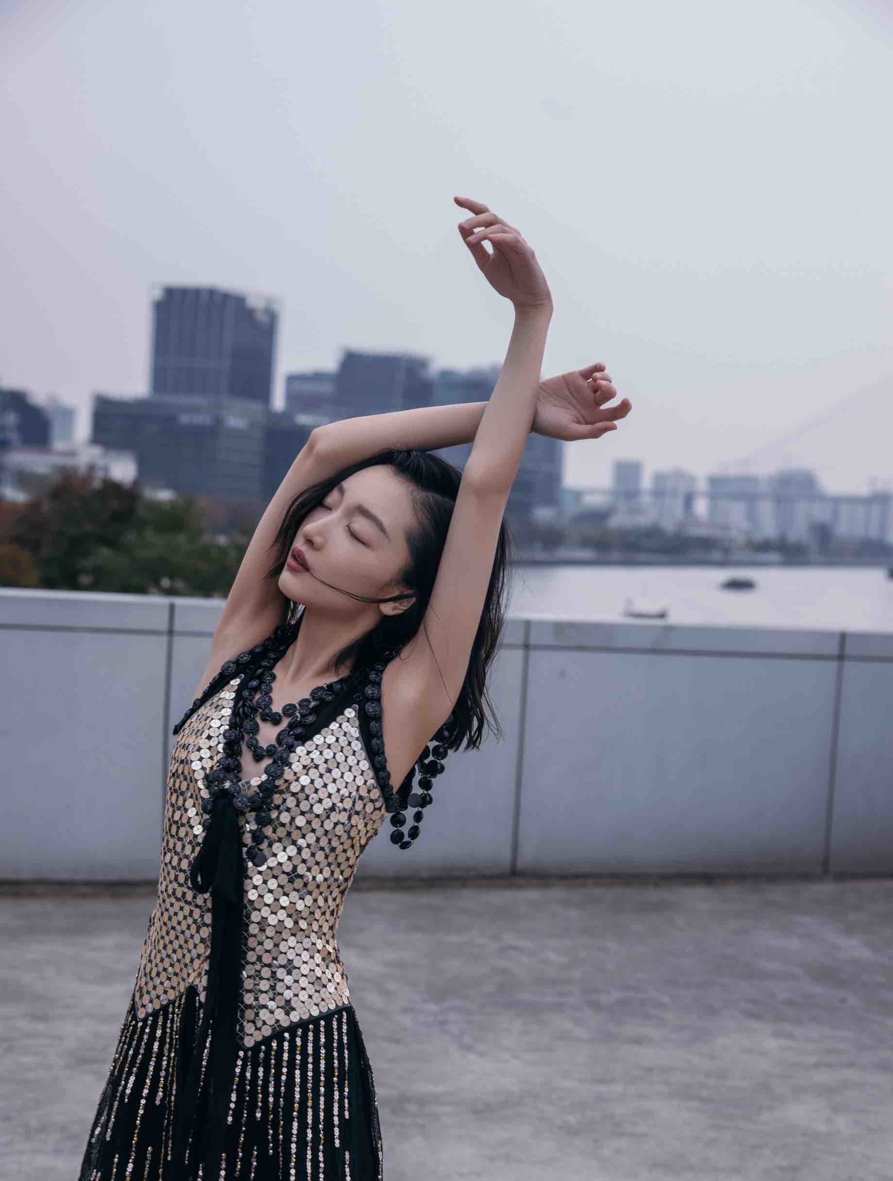 以时尚的眼光仔细康康周冬雨的战袍,珠式亮片和垂感流苏相得益彰,湿发撩人,线条优雅。