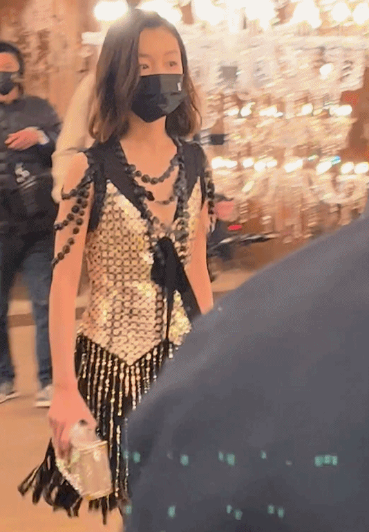 和大多数女明星的拖地长裙有所不同,周冬雨以短款裙出镜,一袭2022早春黑金珍珠片连衣裙,有种“黄金百战穿金甲”的感觉,说句是新晋代言人的“战袍”不过分吧?