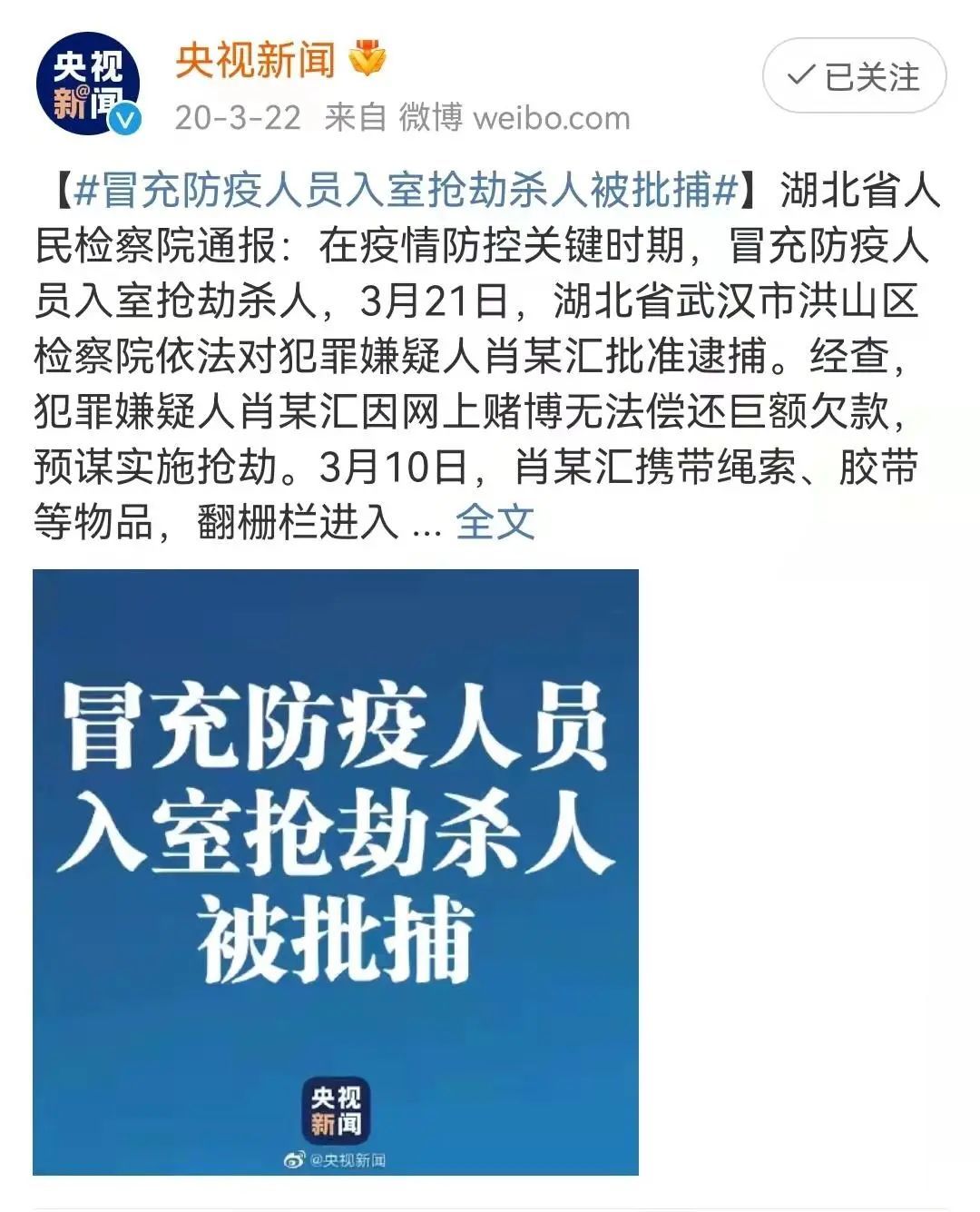 凶手肖某汇自称是“防疫人员”。