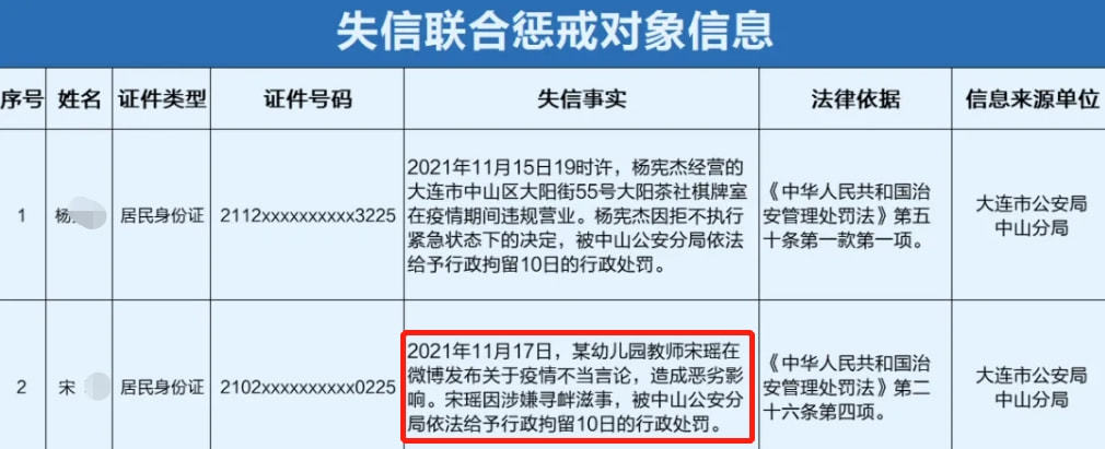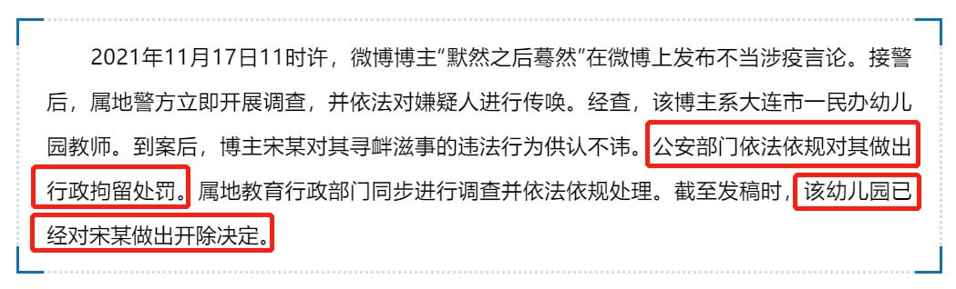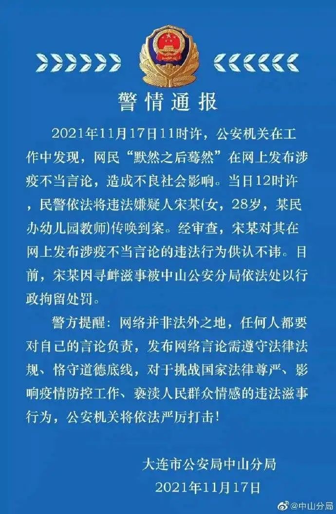 因发布涉疫不当言论,宋某被行政拘留10天。