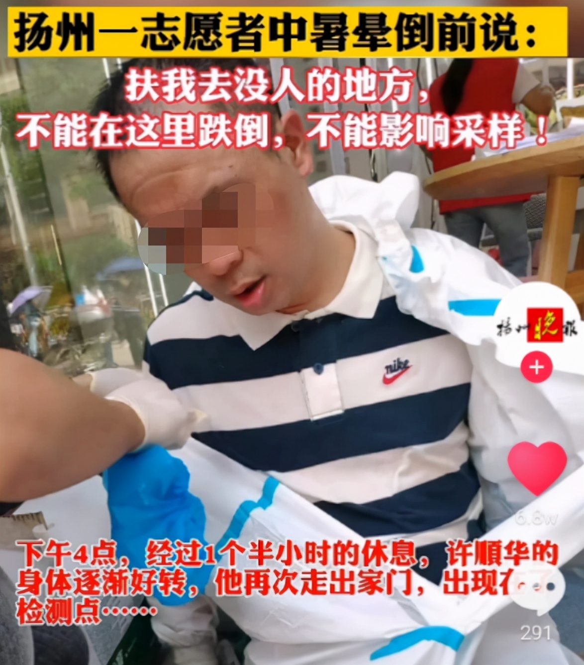 有位防疫志愿者中暑晕倒了。