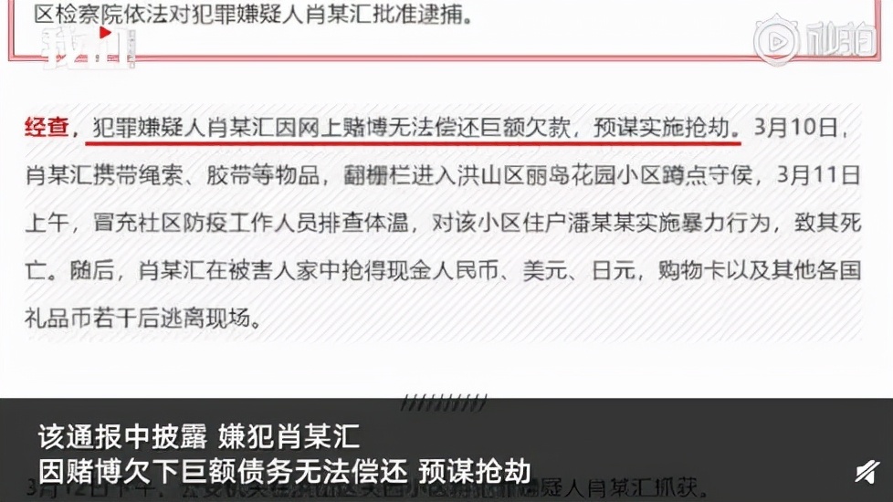 据报道,肖某汇的“杀机”是,因赌博欠下巨额债务,想还钱,就去抢劫。