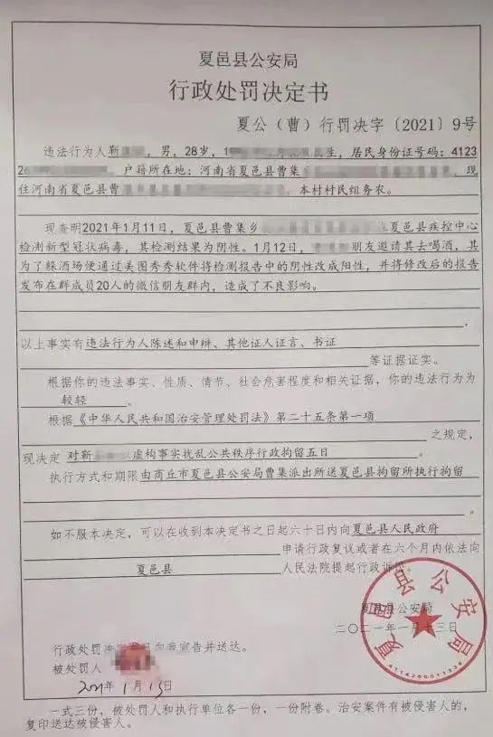 1月12日,河南男子靳某,把自己的核酸检测报告发在微信群。