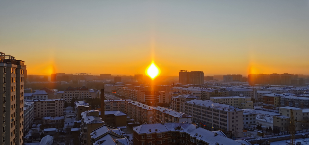 今天早上日出之后,位于内蒙古呼伦贝尔市海拉尔区的居民们,竟然在天空中看到了宛如二郎神的“三只眼”,原来是有“三个太阳”同时整齐地排成一列纵队,俯视着整座城市,闪现出耀眼夺目的光芒。