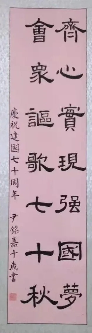 尹铭嘉,男,13岁,于2016年随华世奎先生第四代传人黑中三先生学习书法至今。其间多次参加学校、天津市及全国各界书法比赛,并数次获奖。现中国硬笔书法协会少年儿童书法会员、天津市硬笔书法协会青少年会员。