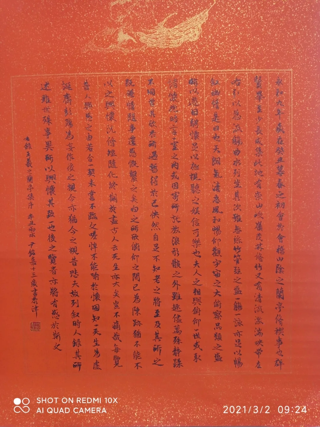 自2017年暑假开始在传奇书院学习软笔书法至今已有三年多时间了。在这三年的软笔书法学习过程中,我有喜有悲,有苦有乐,有哭有笑,但我也收获满满,在多次比赛中获奖,2020年在《青少年书法报》创刊35周年全国少年儿童书法艺术大赛中,获得一等奖。我酷爱软笔书法,从接触的第一天开始,我就被它深深吸引了。虽然有时候感到很苦很累,但在王老师的辛苦指导下,我收获的更多的还是快乐。
