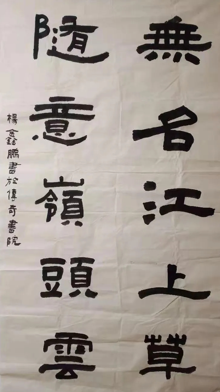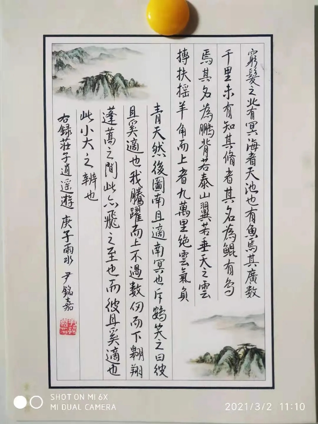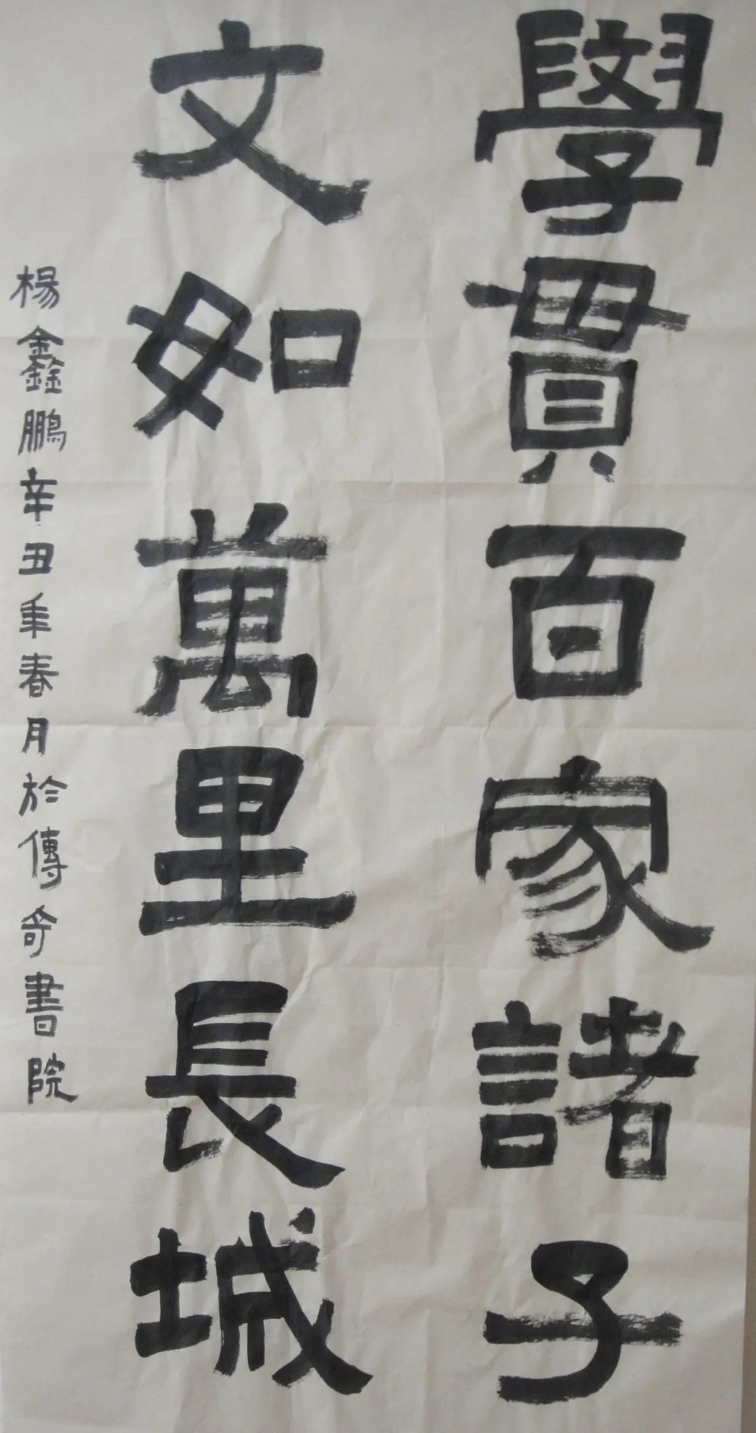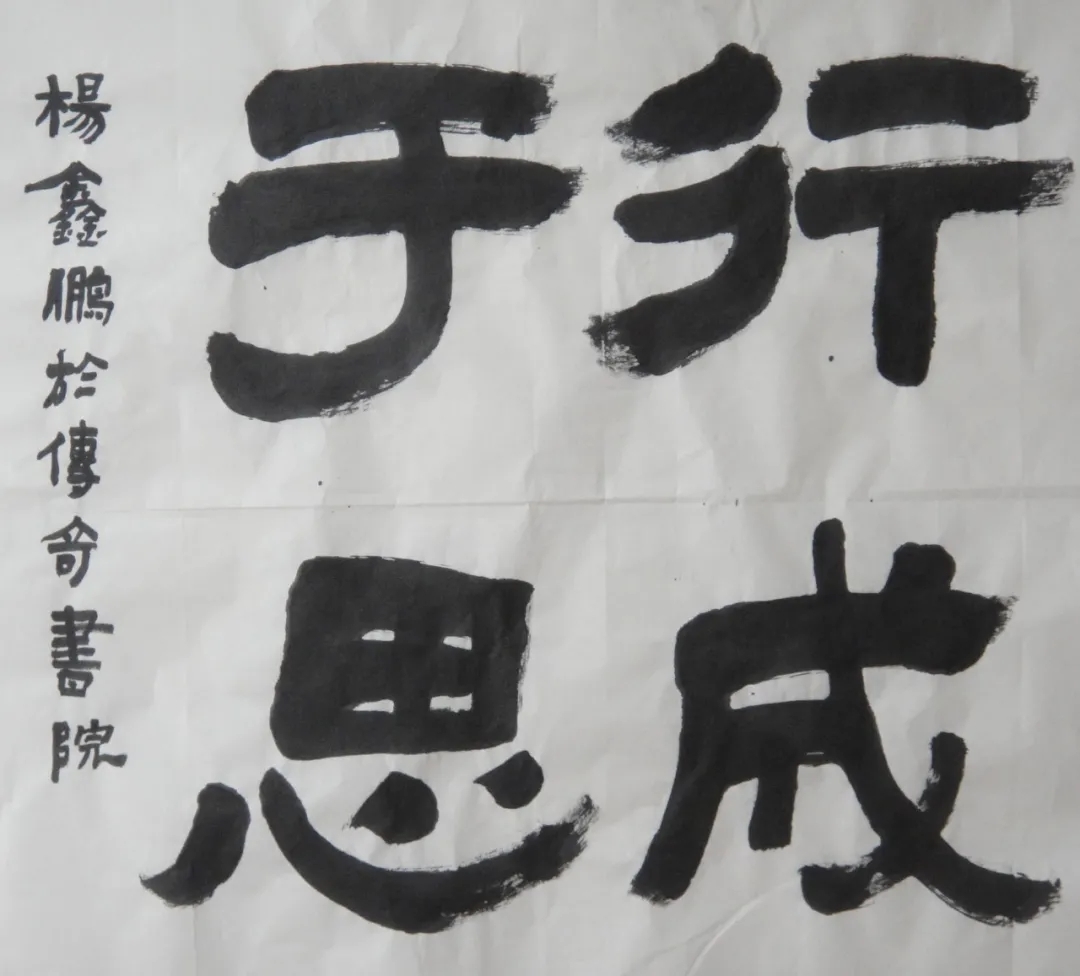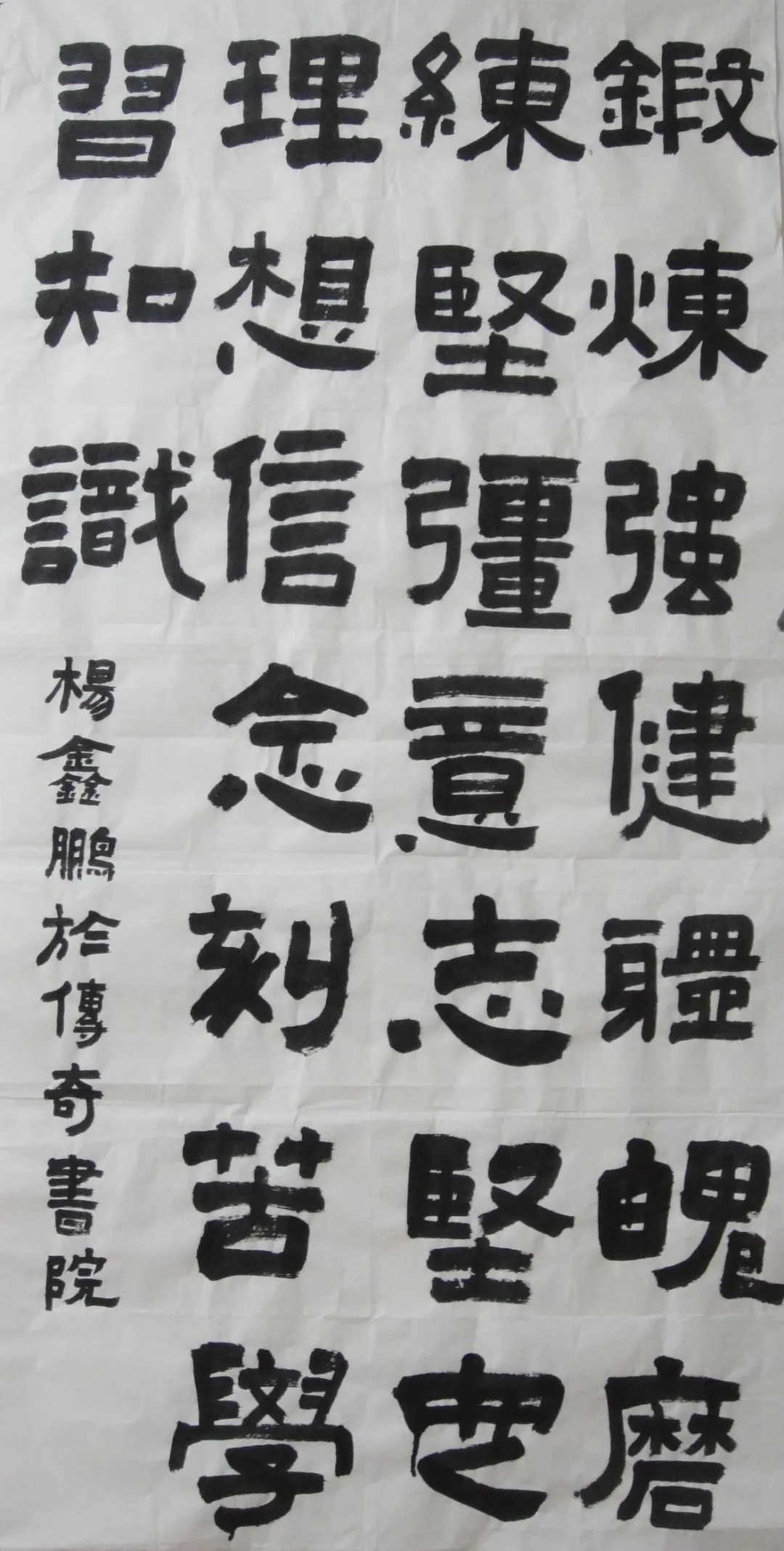 杨鑫鹏同学学习软笔书法已经三年有余了,前两年进步缓慢,但一直没有放弃努力,近一年突破了瓶颈。在今后的学习道路上,你要沉心静气、自省自悟、取长补短方能有更大的突破。