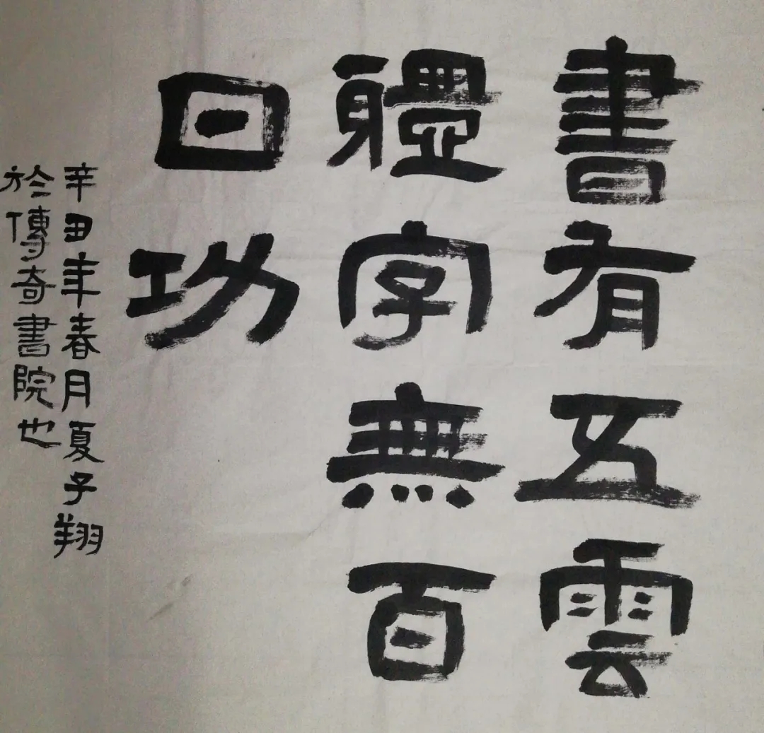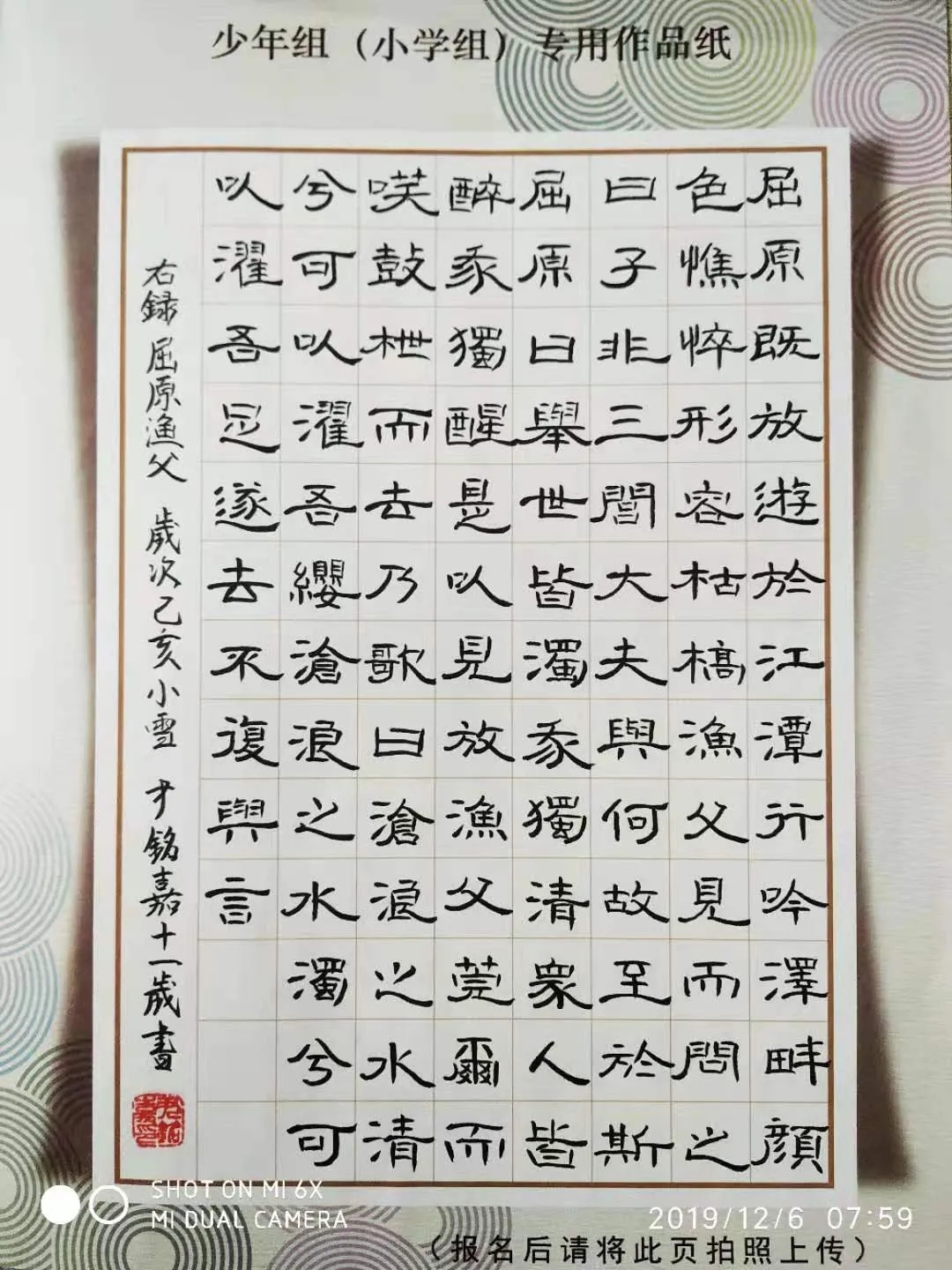 大家好!我是合肥双凤中心小学六(二)班的夏子翔,今年12岁了,我的爱好是:打羽毛球、打乒乓球、看书、跳街舞,练习书法等。在王老师的精心培养下,我对书法产生了浓厚的兴趣,并且还在今年8月参加了全国青少年书法大赛,这使我对书法的热爱更是又提升了一个高度,在以后的日子里我会加倍努力的,加油!!!