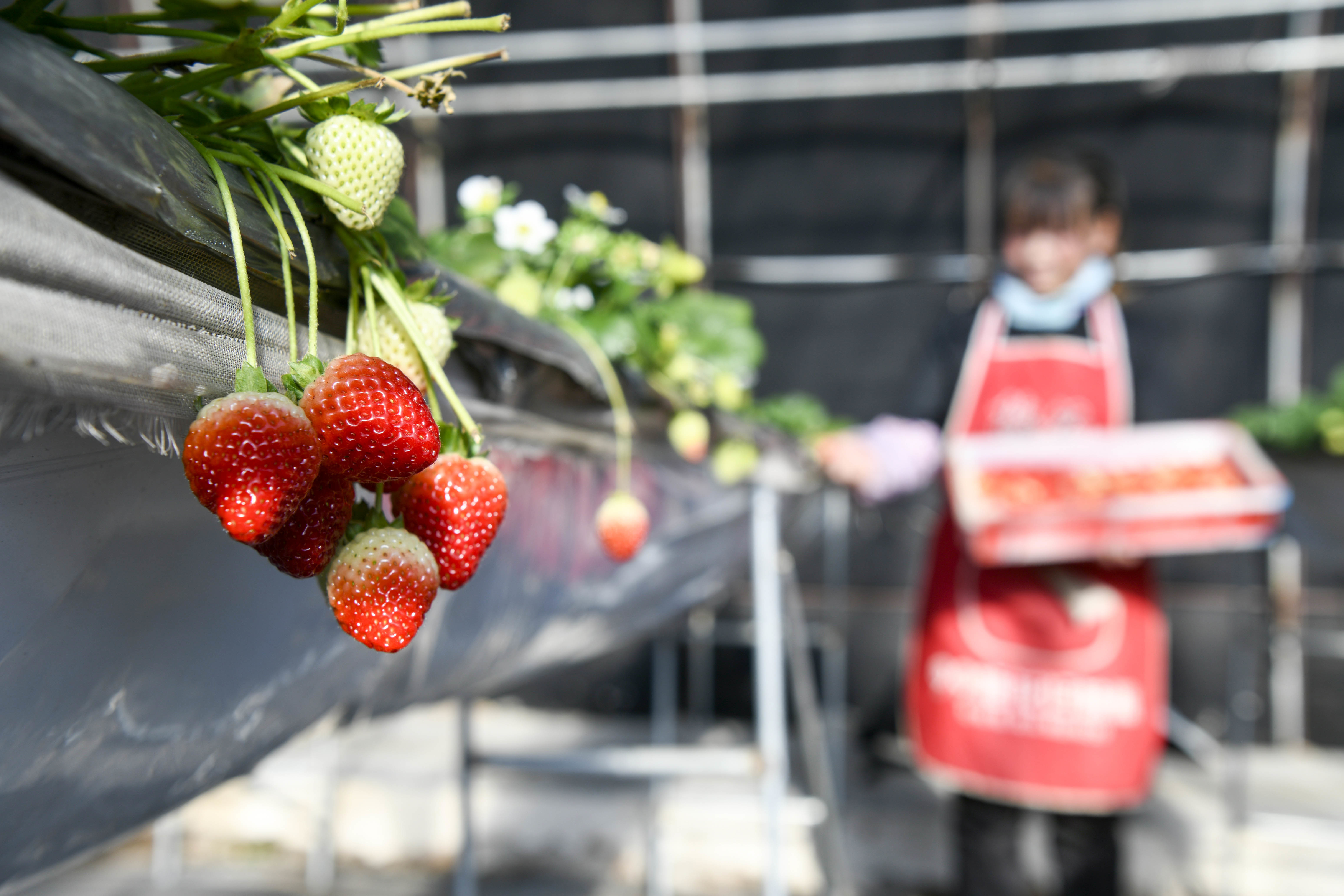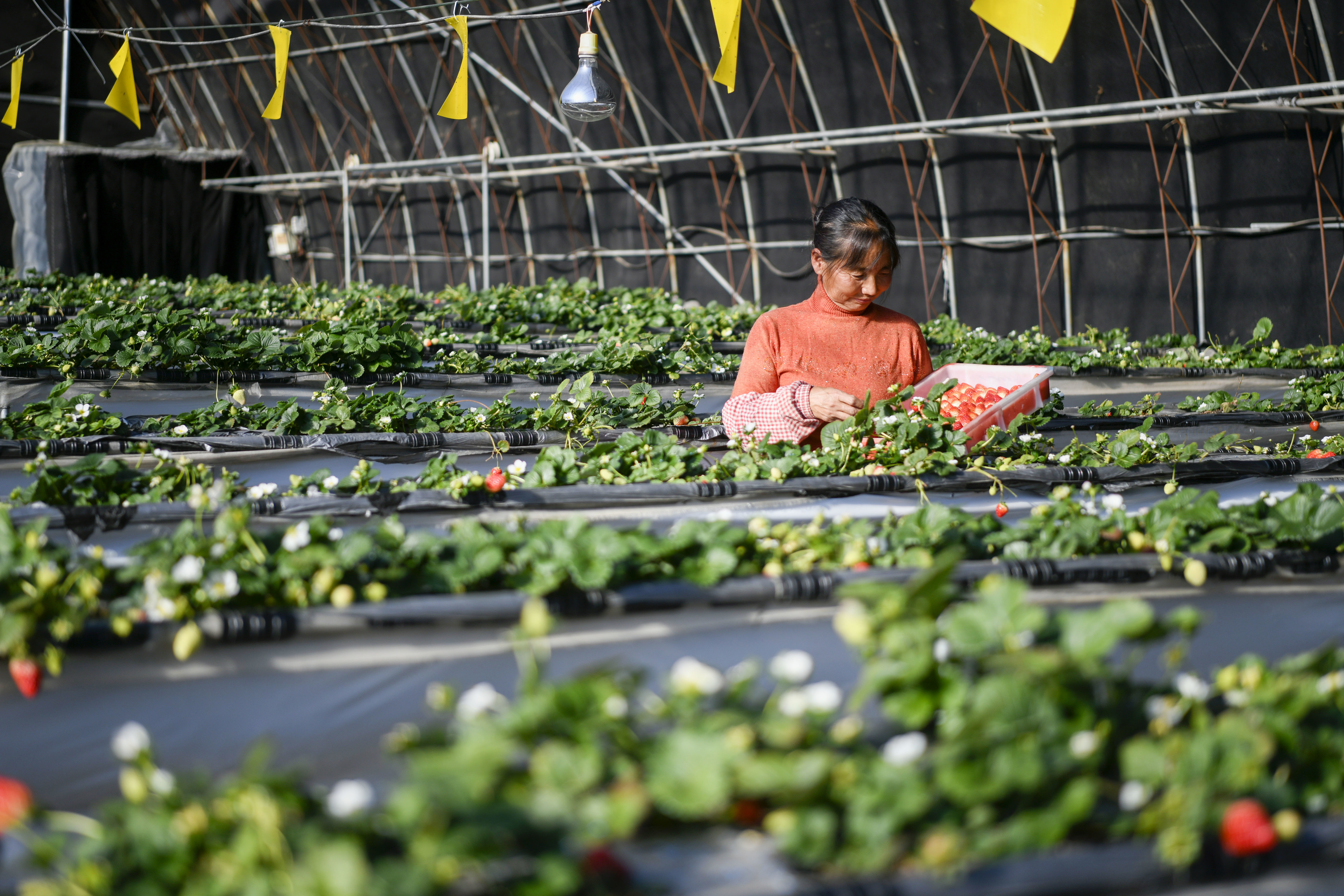 11月26日,在隆化县七家镇一处草莓种植基地,工人在采摘草莓。新华社发(王立群 摄)