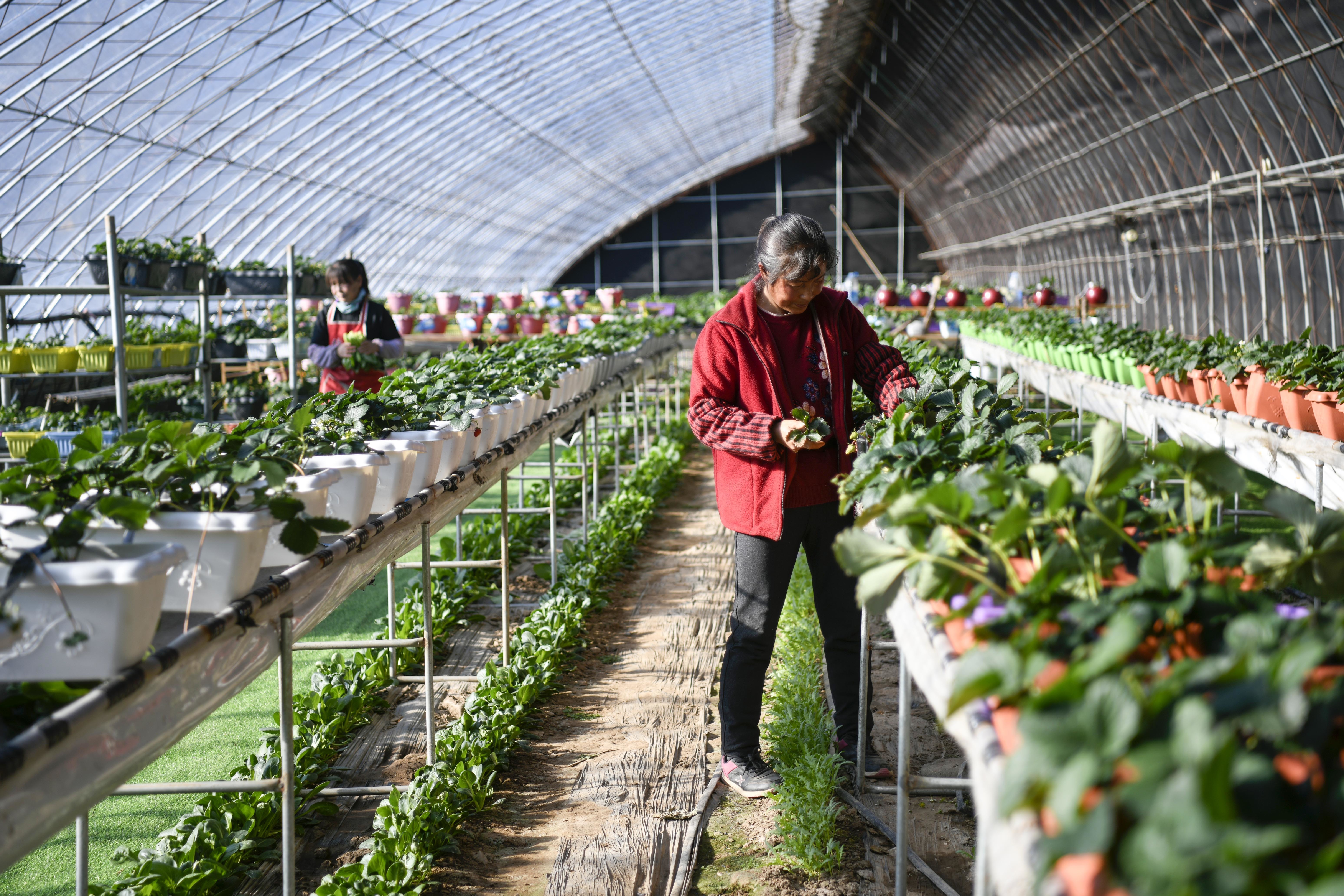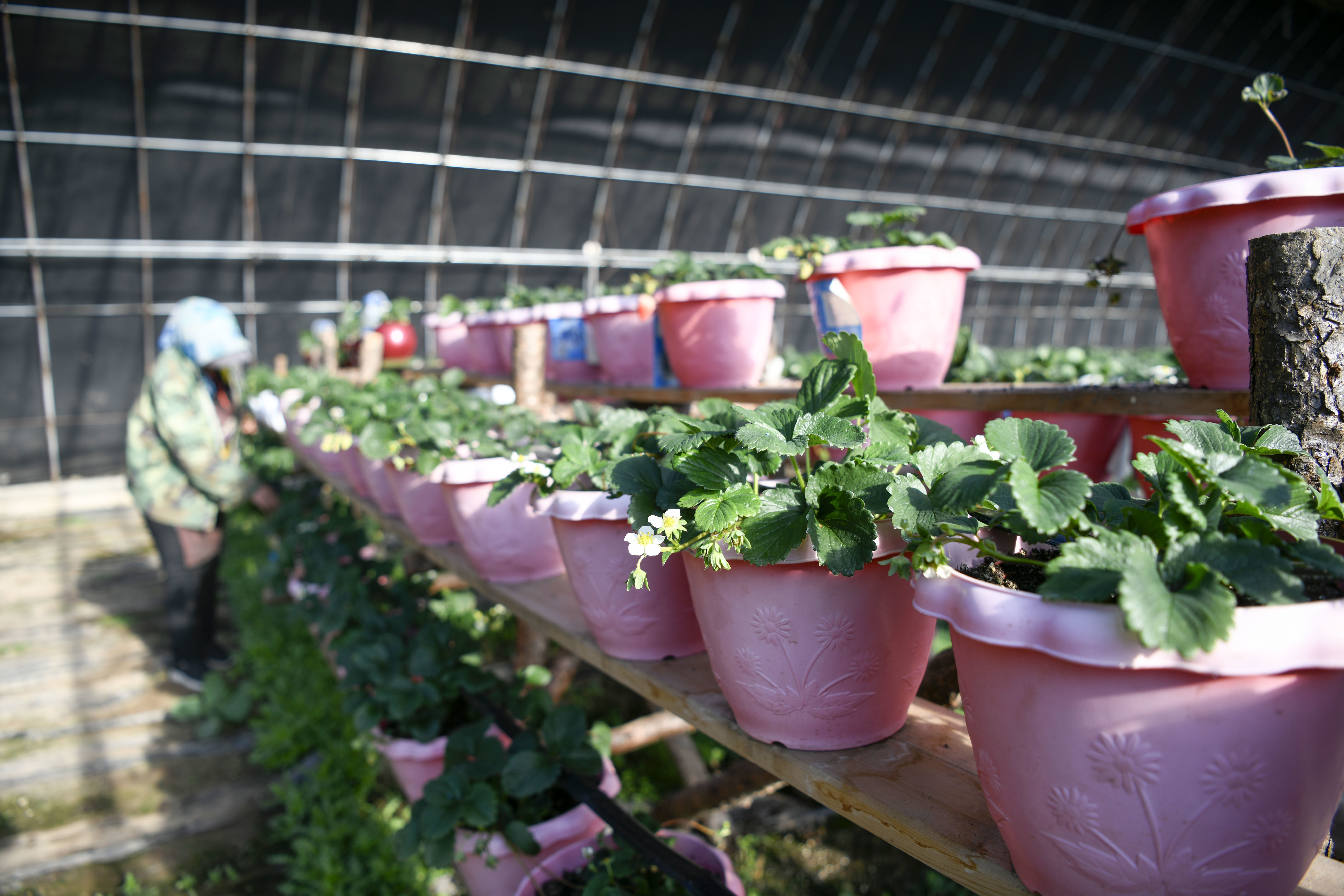 11月26日,在隆化县七家镇一处草莓种植基地,工人在管护盆栽草莓。新华社发(王立群 摄)