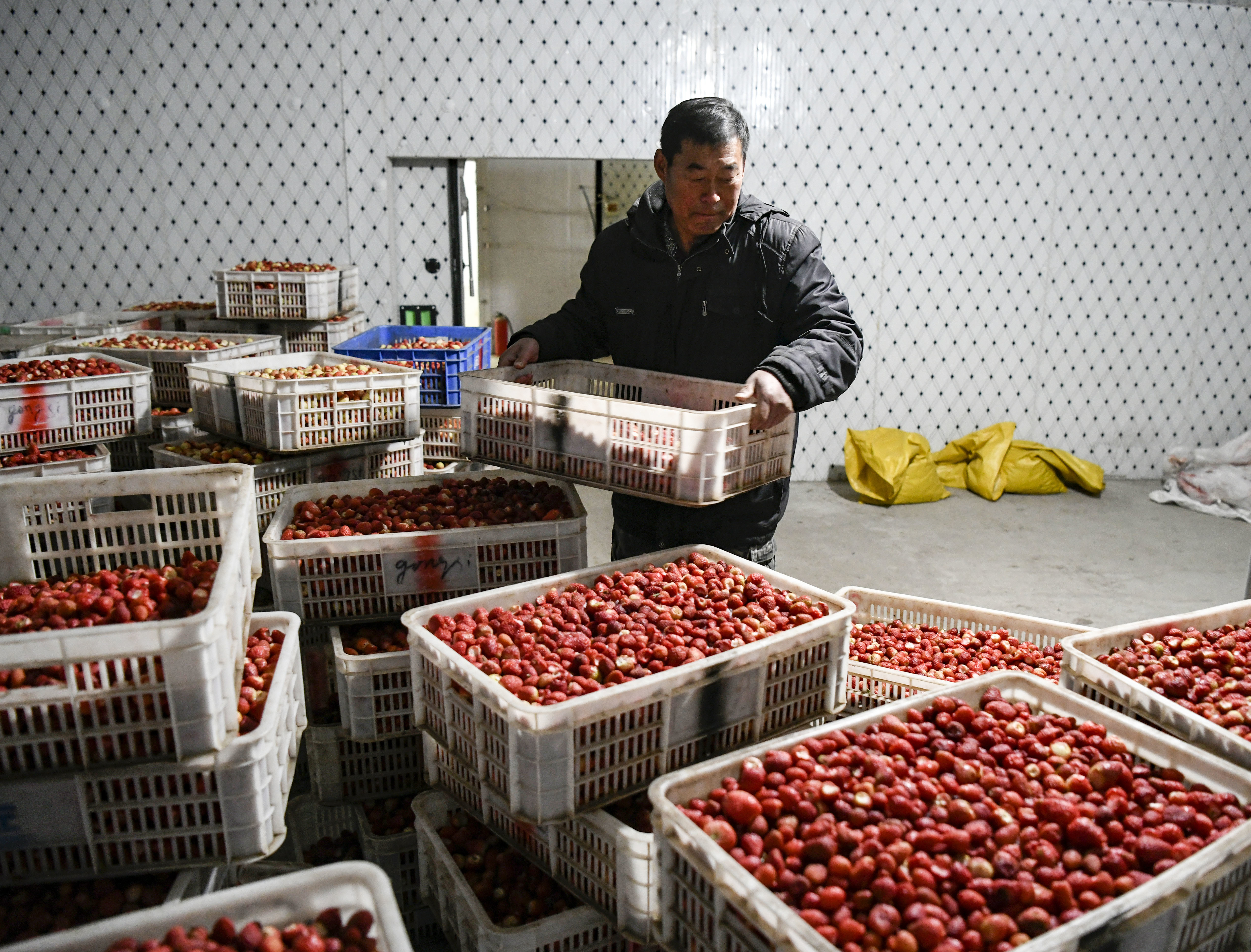 11月26日,在隆化县七家镇一处草莓种植基地,工人在搬运用于制作果浆的草莓。新华社发(王立群 摄)