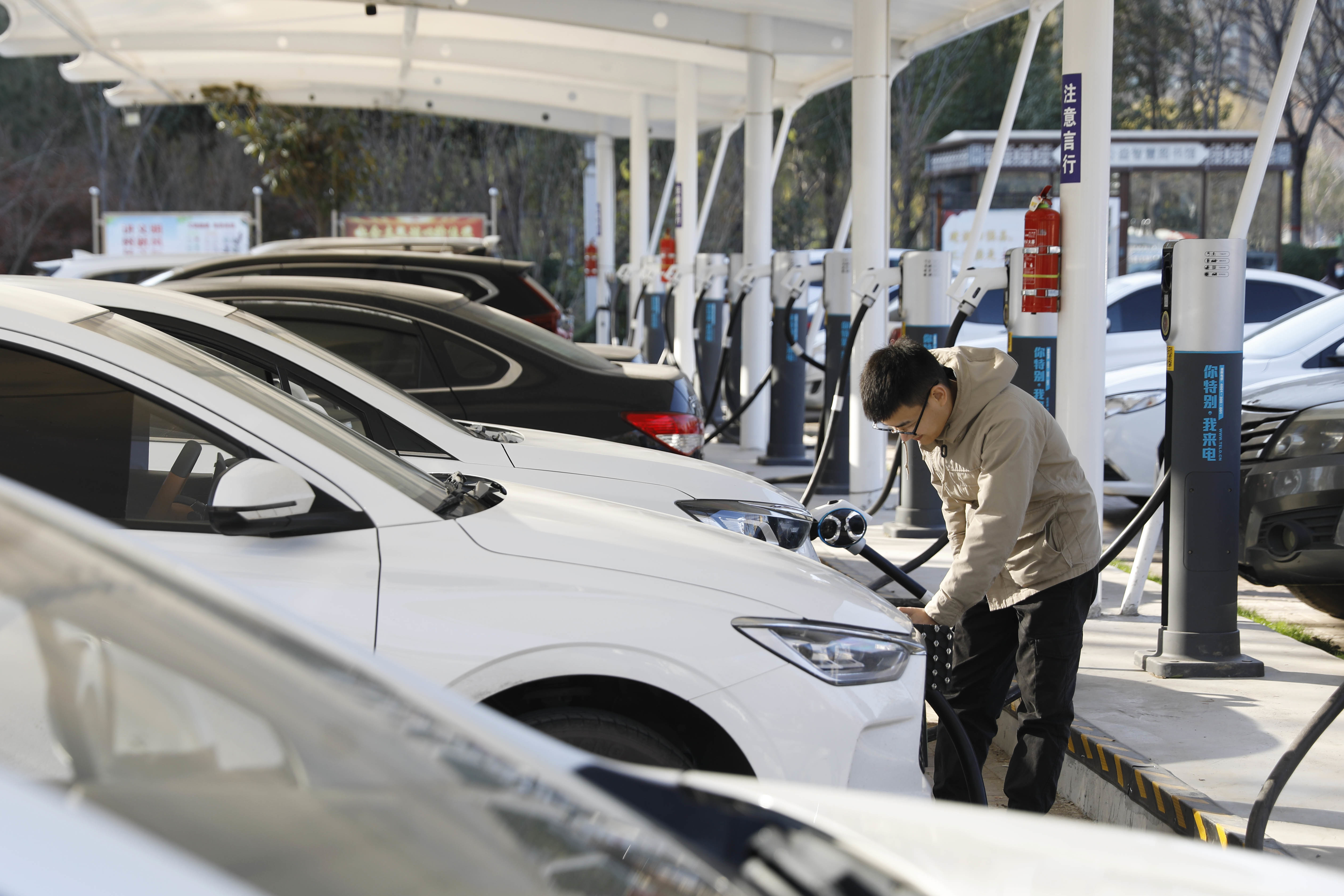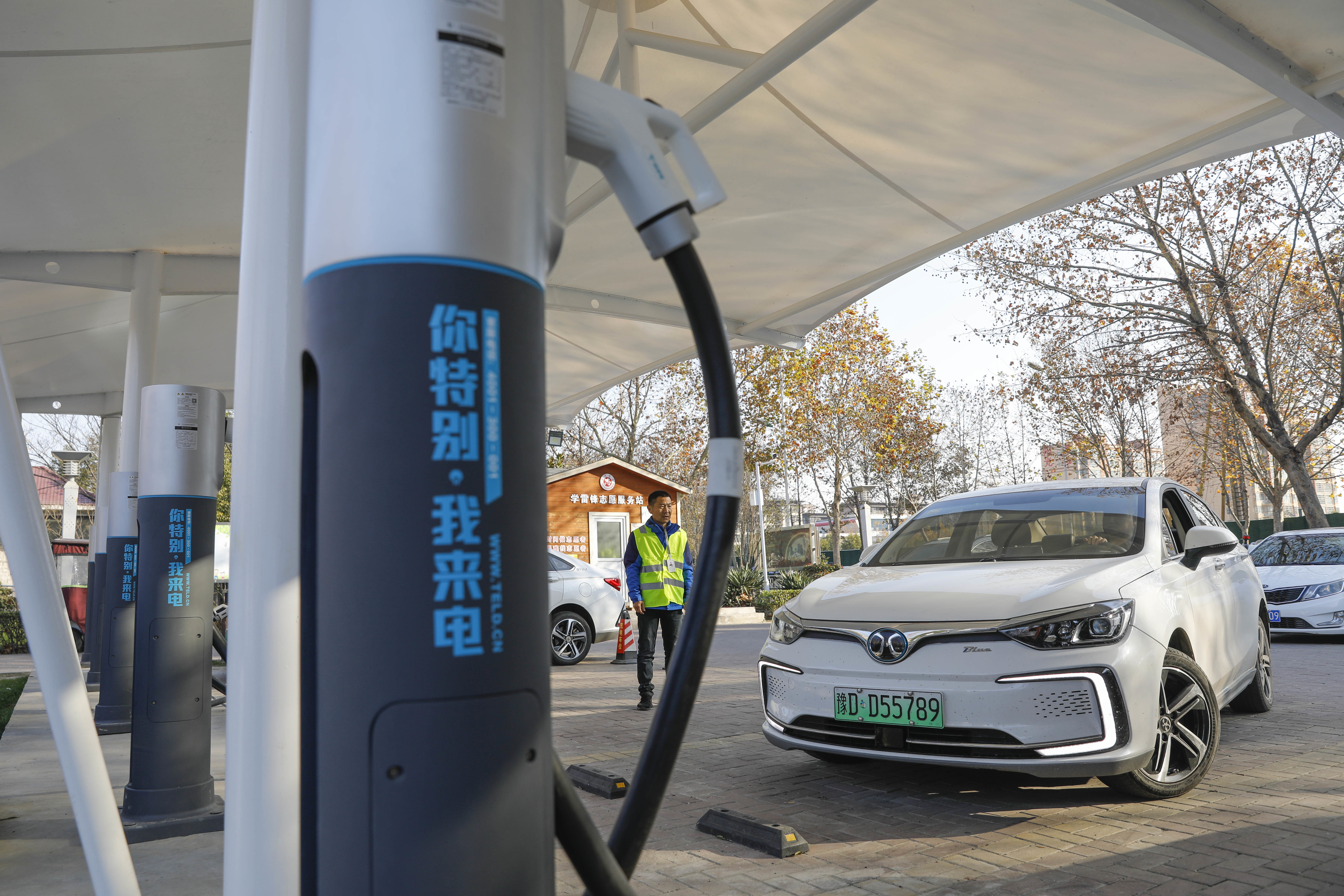 11月26日,在宝丰县龙兴湖公园,市民使用充电桩为新能源车充电。新华社发(何五昌 摄)