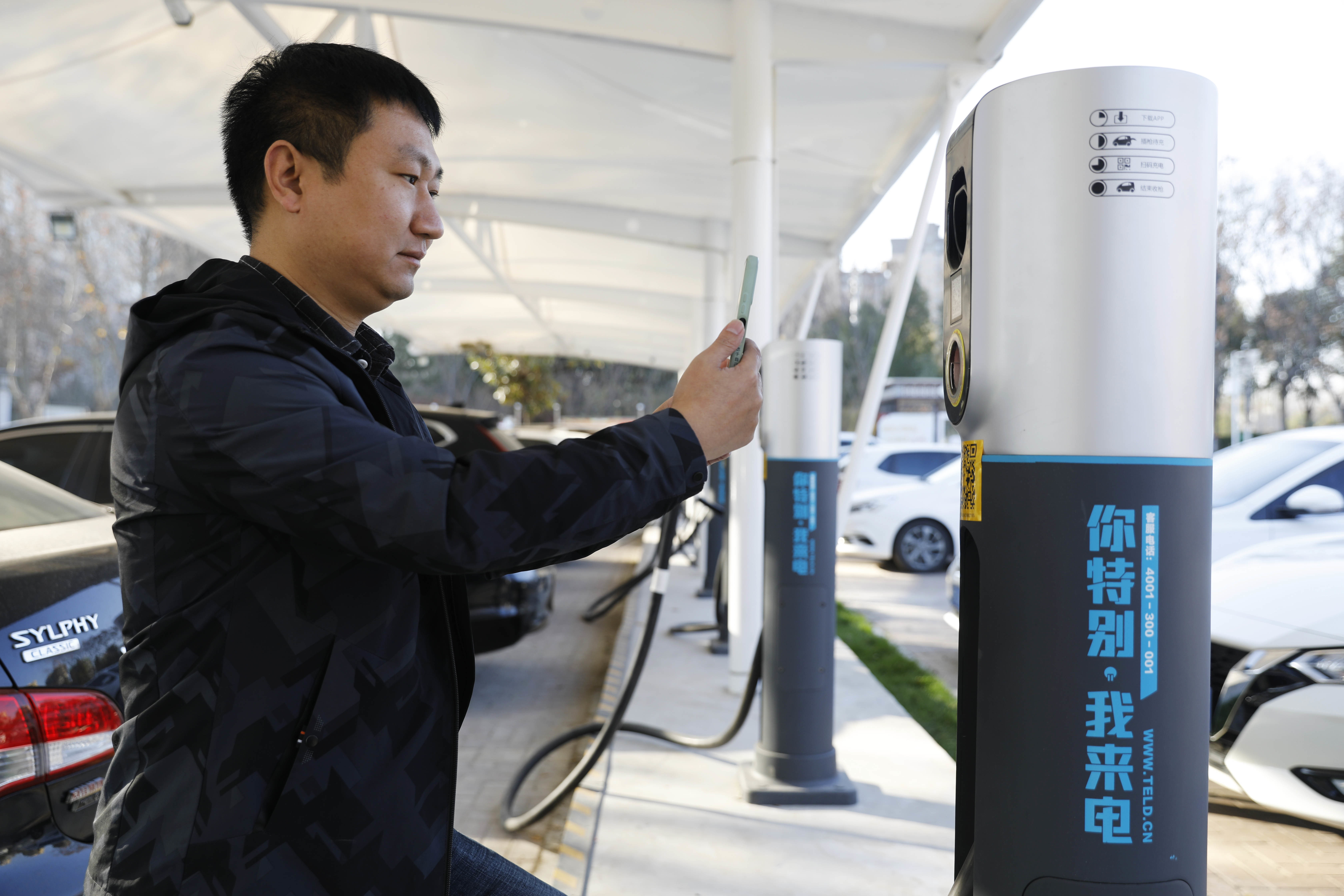 11月26日,在宝丰县龙兴湖公园,居民通过手机扫码,使用充电桩为新能源车充电。新华社发(何五昌 摄)