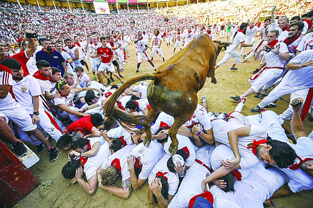 还有15分钟,那些被激怒的公牛就要被释放出来。有人开始做暖身运动,有人还拿着酒杯谈笑风生。清晨的报章,报道昨天的意外,血腥的封面,恐怖的报道,阻止不了跃跃欲试的决心。