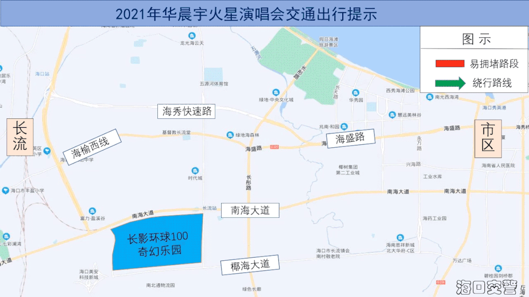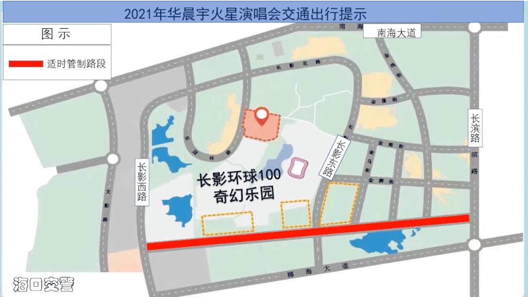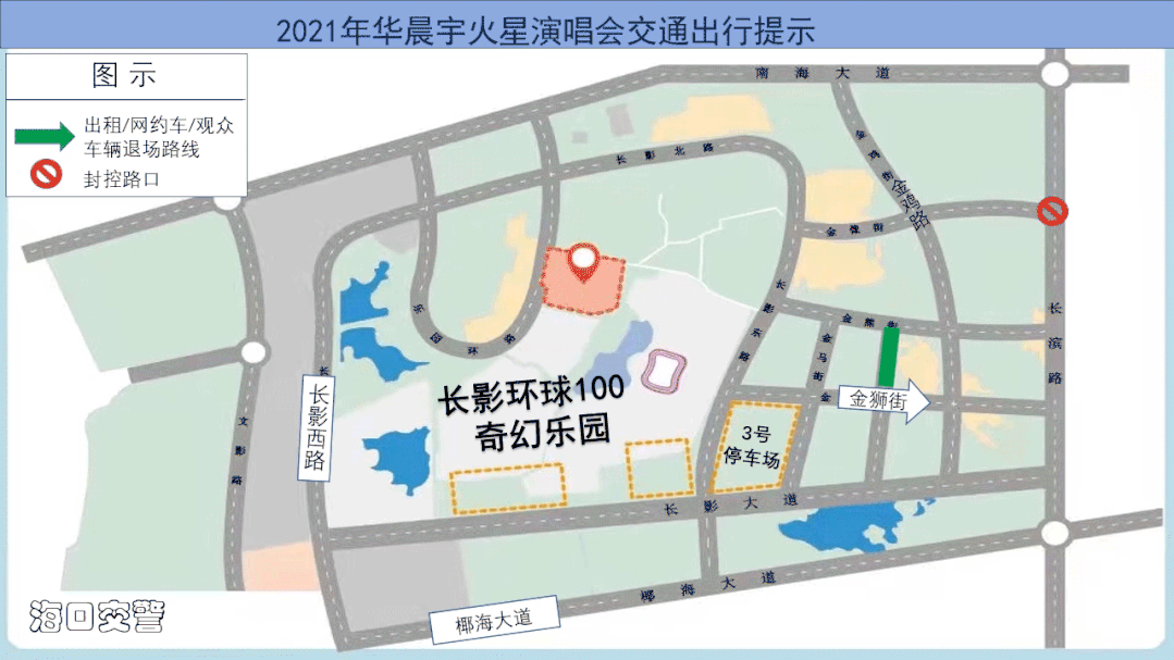 海口公安交警温馨提示:通过管制路段的车辆和行人必须遵从现场执勤民警、园区保安员指挥或按交通标志指示行驶。自驾前往演唱会现场的市民请浏览高德、百度电子地图查看路况信息及停车场信息,避开正在管制、交通流量大的路段,减少出行不便。