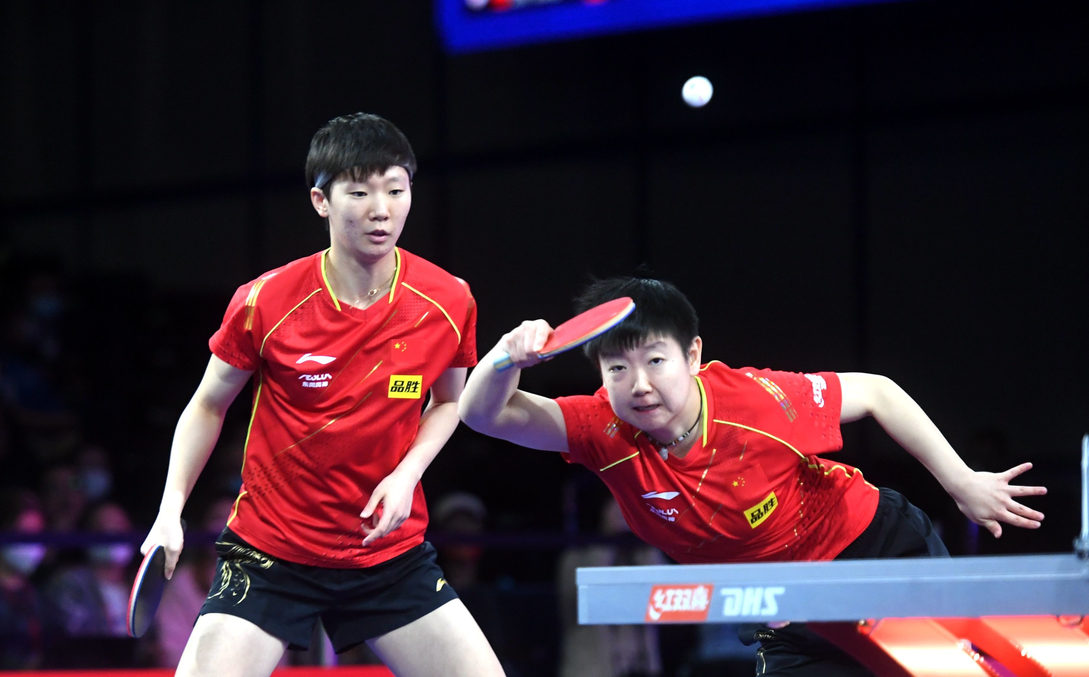 新华社照片,休斯敦(美国),2021年11月27日 (体育)乒乓球——世乒赛:孙颖莎/王曼昱晋级女双八强 11月26日,孙颖莎(右)/王曼昱在比赛中。 当日,在美国休斯敦进行的2021世界乒乓球锦标赛女双第三轮比赛中,中国组合孙颖莎/王曼昱以3比1战胜德国组合索尔佳/单晓娜,晋级八强。 新华社记者 吴晓凌 摄