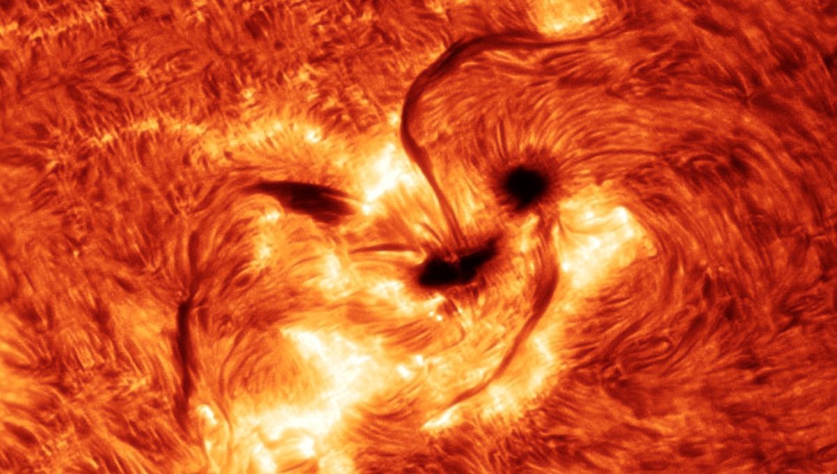 我们先要讲一下太阳发光表面的物质形态,他们平常接触到的物质形态主要有三种:气态、液态和固态,但太阳表面由于高温的作用,物质呈现为第四种形态:等离子态。这是由于原子在高温作用下,电子脱离原子核束缚,成为游离状态的自由电子。这些游离状态的等离子体在高温下产生剧烈的热对流,类似于地球上的台风形成,但在太阳表面所产生的的“台风”强度是地球的上千倍。而剧烈旋转的带电粒子流产生强烈的局部磁场,这些磁场进一步影响了带电的等离子体的运动,于是会产生一些凹陷的低温区域,这些低温区域比周围区域的温度降低1000-2000K,以致在强烈的温度反差下,它们看起来是黑的。