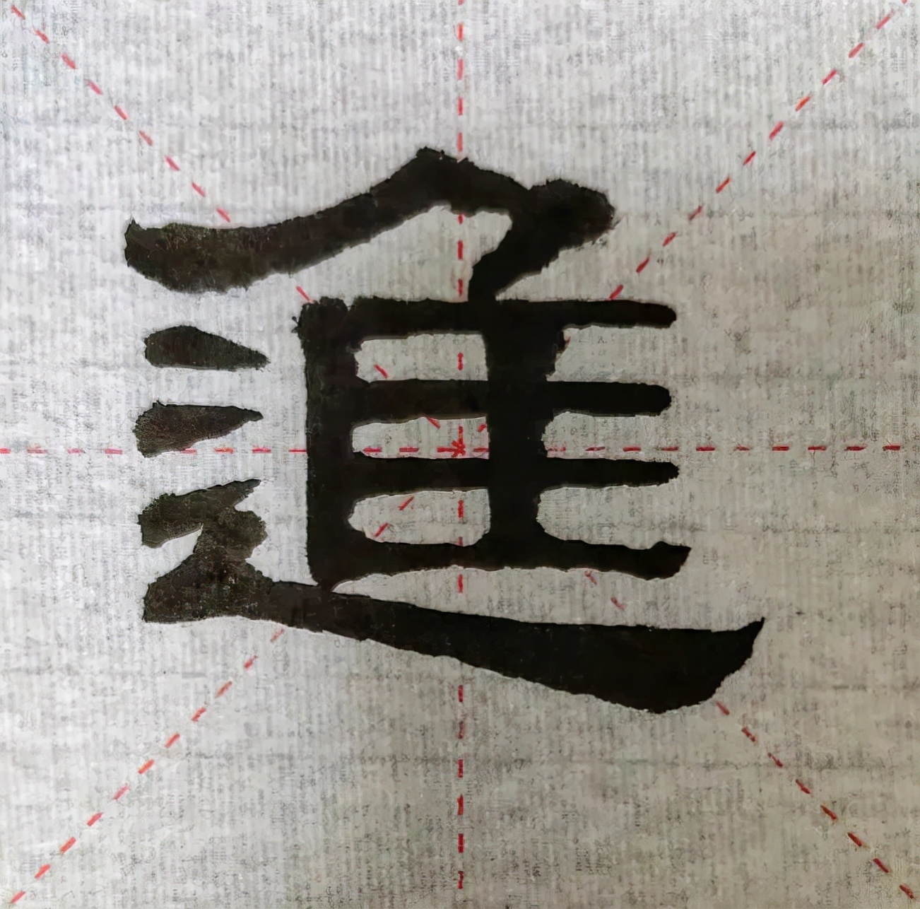 但在实际书写的时候,选择笔画①为主笔将会遭遇这样一个问题:因为笔画①的下方还有相对复杂的结构,这一笔即便设定为主笔也不能写得太重太粗,否则将对下面的结构形成极强的空间压迫感。