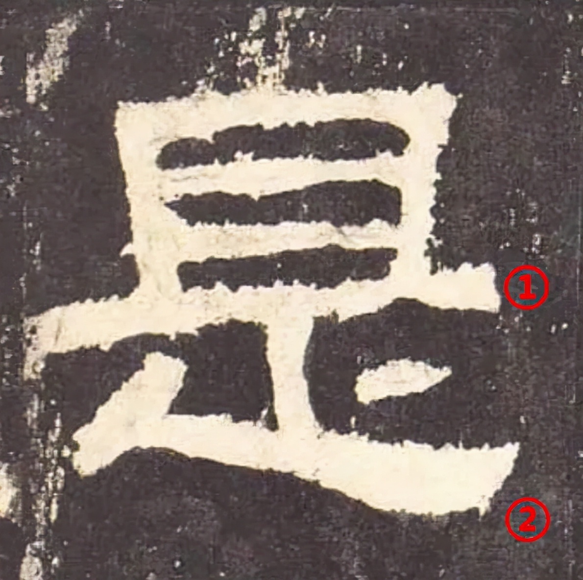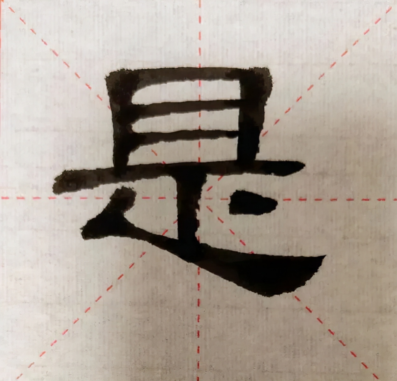 临摹这个“是”字的时候,我们必须在笔画①和②之间做一抉择,究竟以谁为主笔。从图片上看,似乎笔画①更抢镜,因为它更长,把笔画②给“罩住了”。