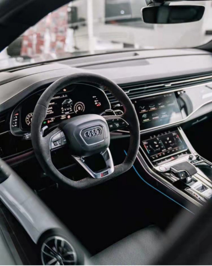 这款车的内饰风格非常的豪华,12.3英寸仪表盘,10.1英寸MMI多媒体触控屏,支持触摸力度反馈。副驾前的装饰面板能够选择黑色高亮、碳纤、铝的或是黑色橡木材质的。座椅采用运动一体式座椅,有灰色和红色缝线两种,座椅上有蜂窝状压花和RS标识。方向盘有一个RSMODE按键可以设置自己的驾驶模式。奥迪RS Q8与普通Q8一样具备空气悬挂,支持上下90毫米的调节。在加上电动升降的遮阳帘,隐私与防晒的效果都非常好。