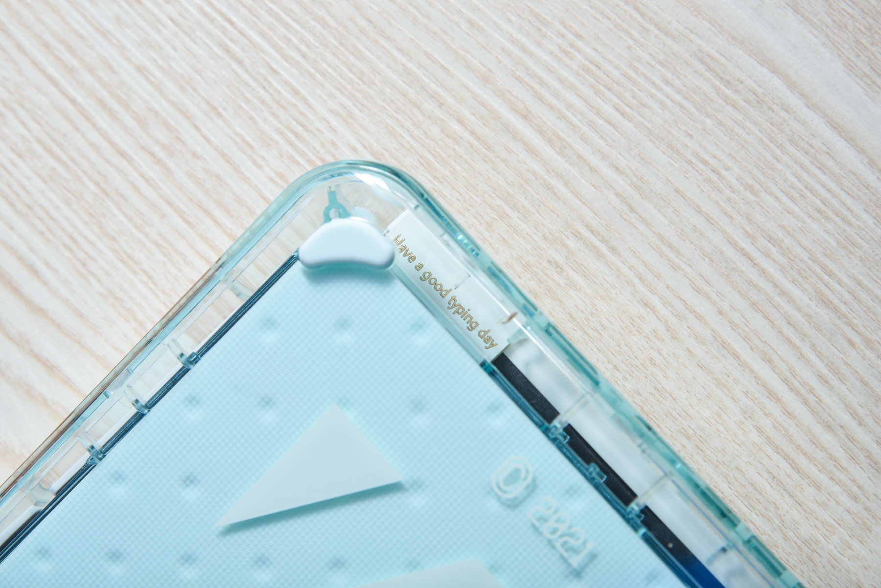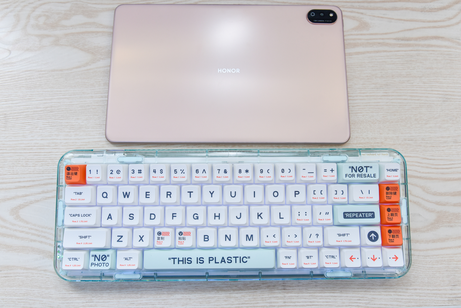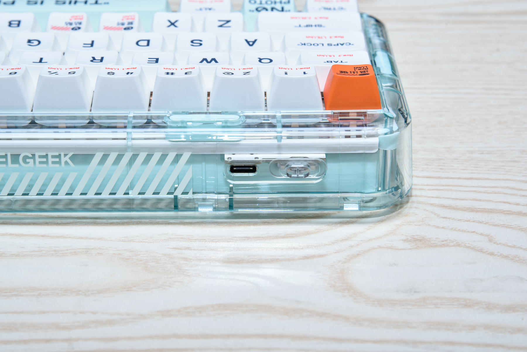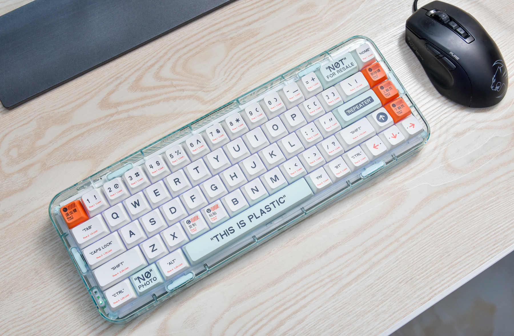 对于打字的手感来说,键帽的设计也很重要。塑料透明配色款的键帽,采用的是PBT热升华MDA键帽,手指接触会有一点点摩擦防滑,而且指腹接触面会有更多。打字的整体感觉十分舒适,快速长时间打字也不觉得容易疲劳。
