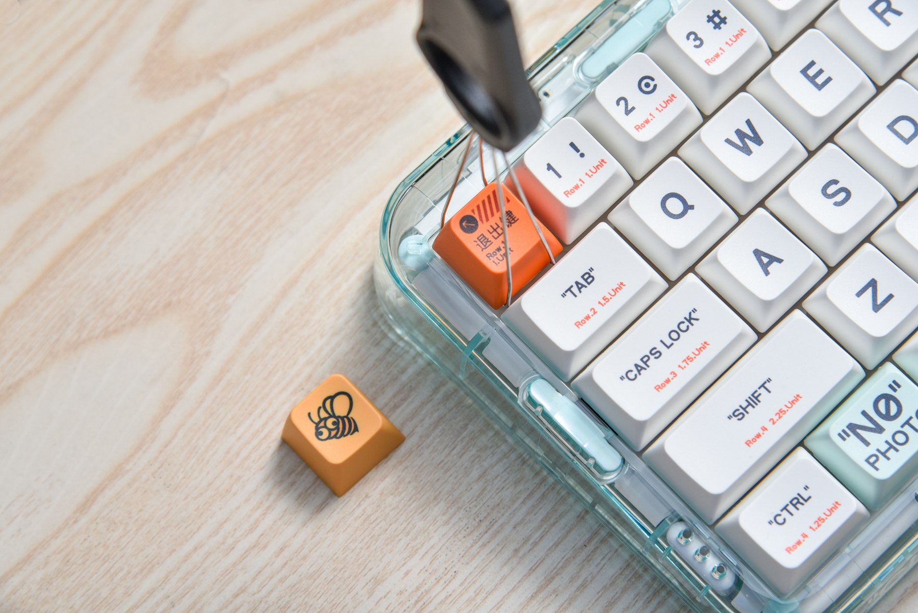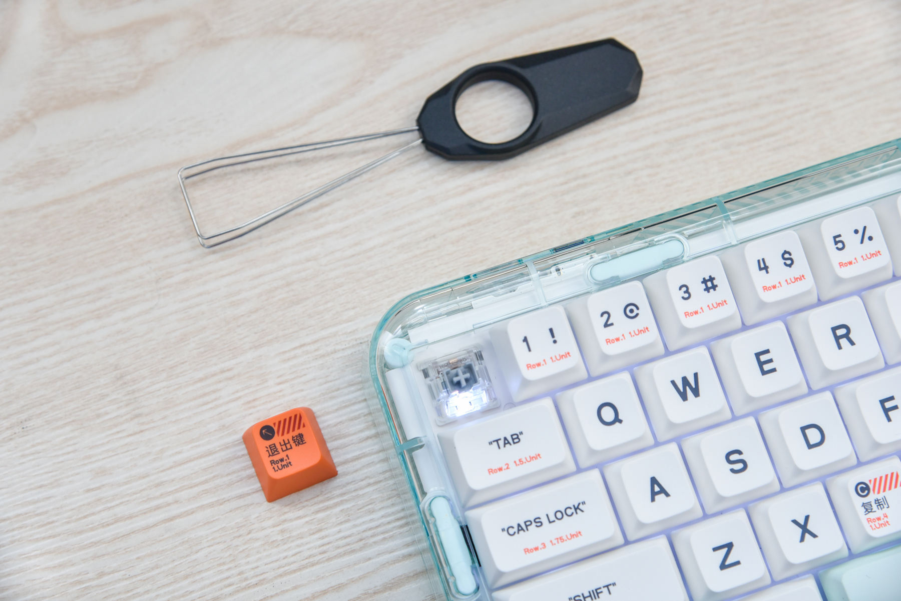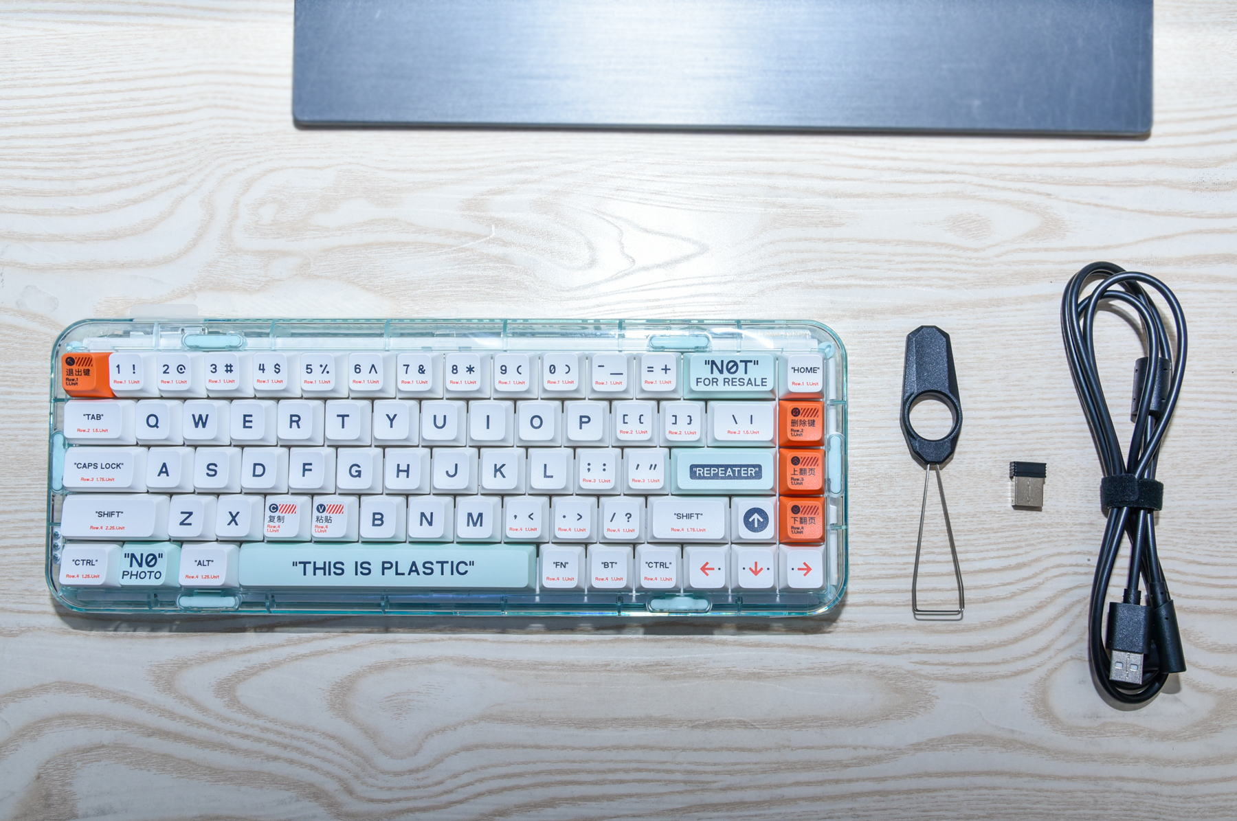 全部的配件在此!贴心配置了拔键器,以前也有体验过,但我想说,虽然外观简单,但这是我用过的最好用的拔键器!轻轻放入,轻轻拔起,完全不用担心外观被划伤。另外还有2.4Ghz的蓝牙适配器和Type-C数据线。这里要说说这把键盘是支持三模连接的,也就是部分手机、平板、电脑自带的蓝牙5.2Ghz+2.4Ghz蓝牙+有线连接。