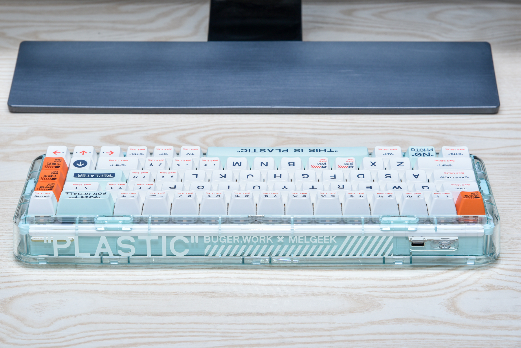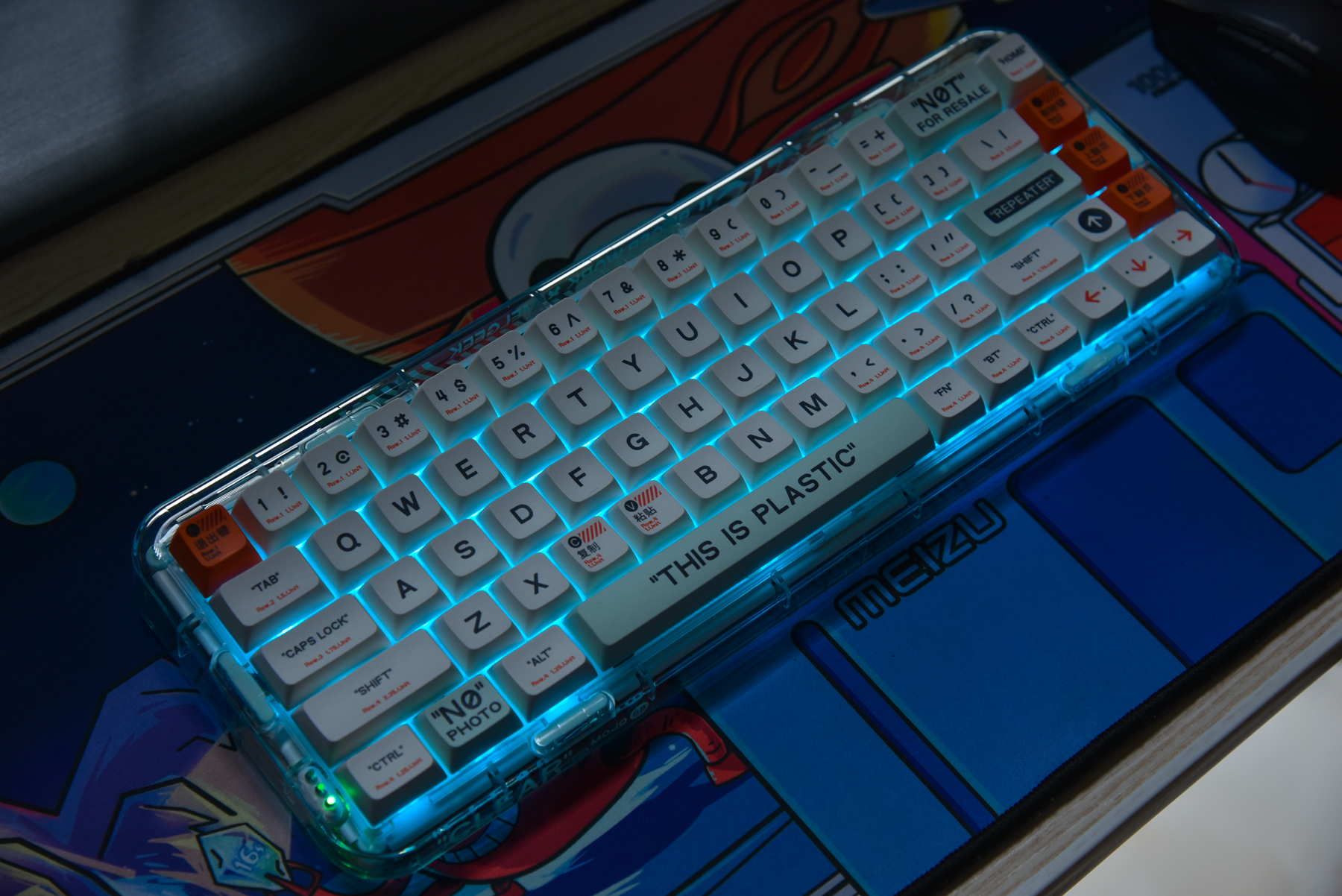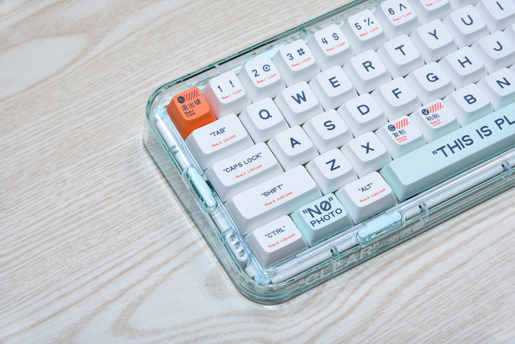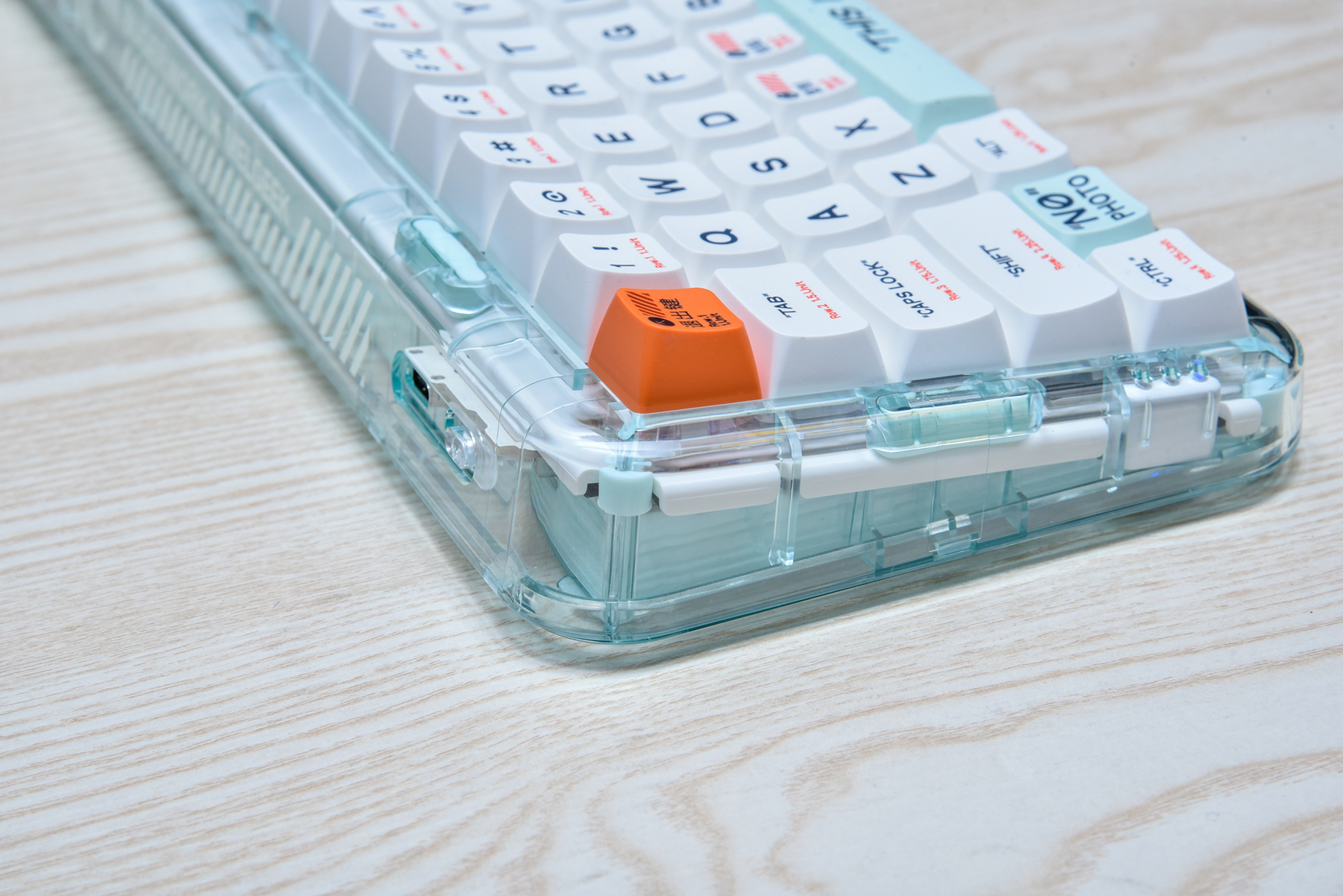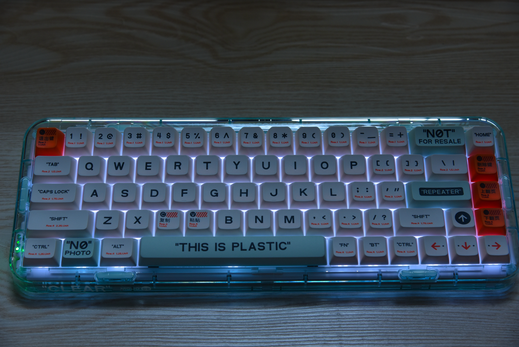 再来整体看看这款小尺寸键盘的外观设计。其实MOJO68有四种颜色,而我拿到的是PLASTIC(透明)款!我觉得这样的设计,我非常喜欢,除了能看到里面的结构设计,打开背景灯,会有更好的氛围感。