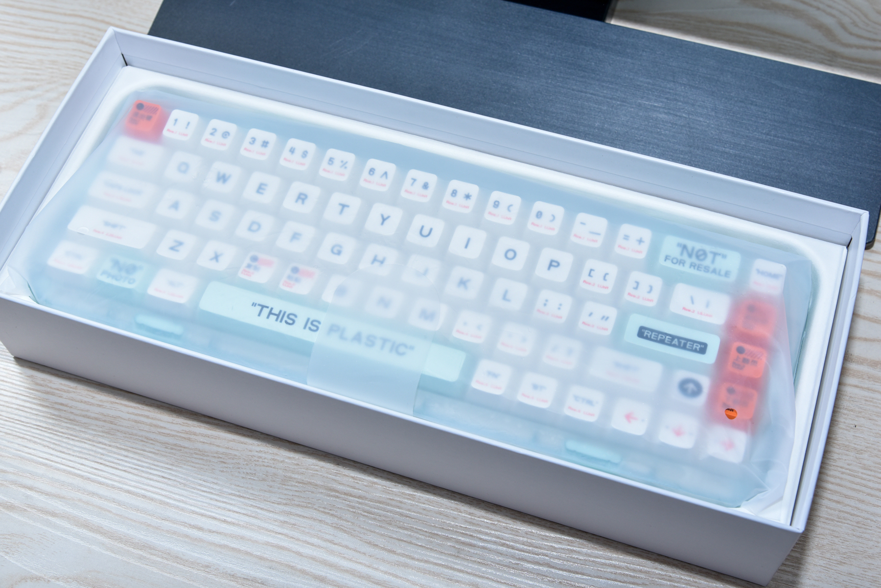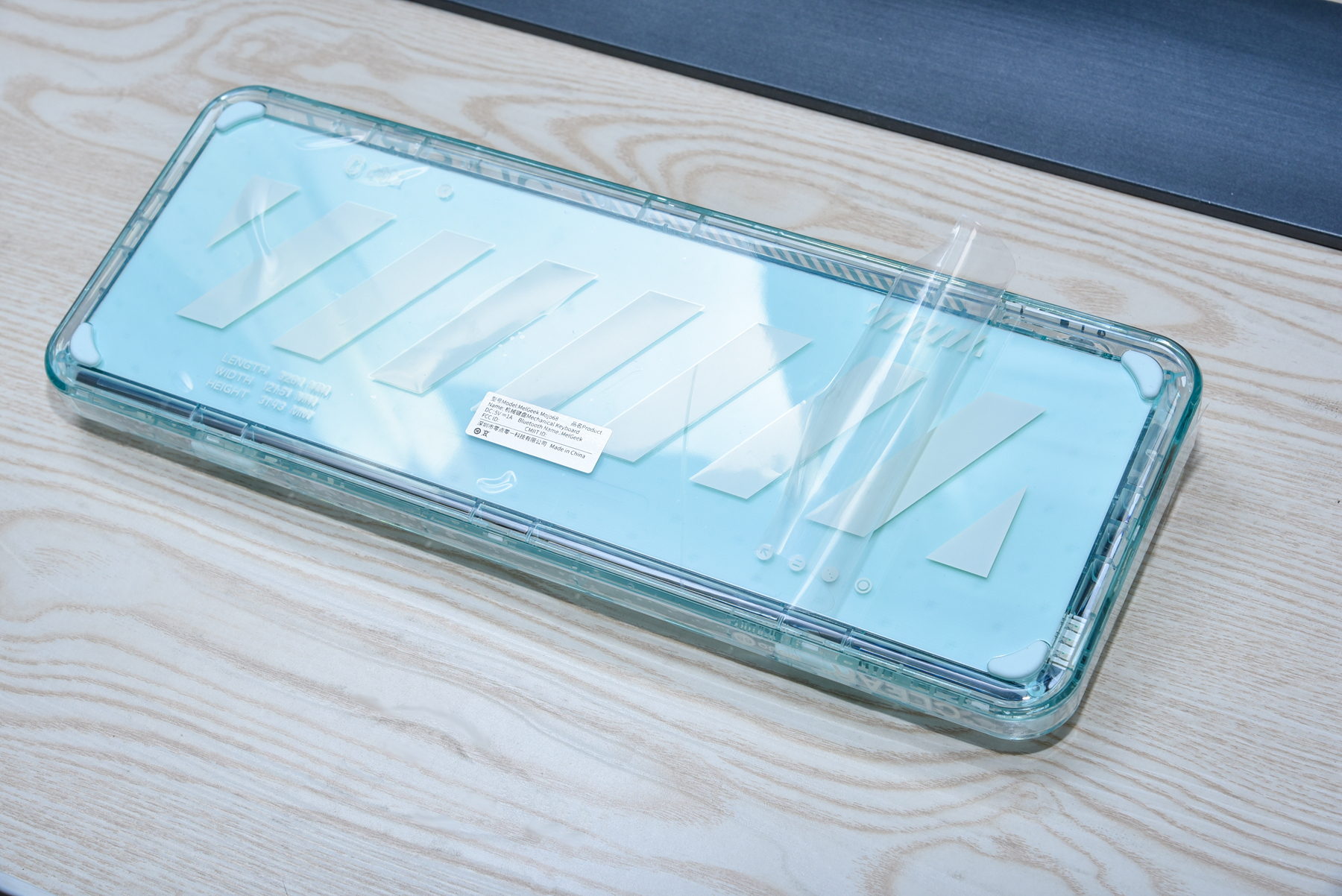 拆开包装后,发现对于透明的外壳保护的非常到位,基本上都是塑料薄膜覆盖保护。包括了键盘的四周侧边!就重量来说,我是没想到小尺寸键盘也挺重的,不能说方便携带,但是放在桌上还是很稳定,不会出现打字打游戏移位的情况!