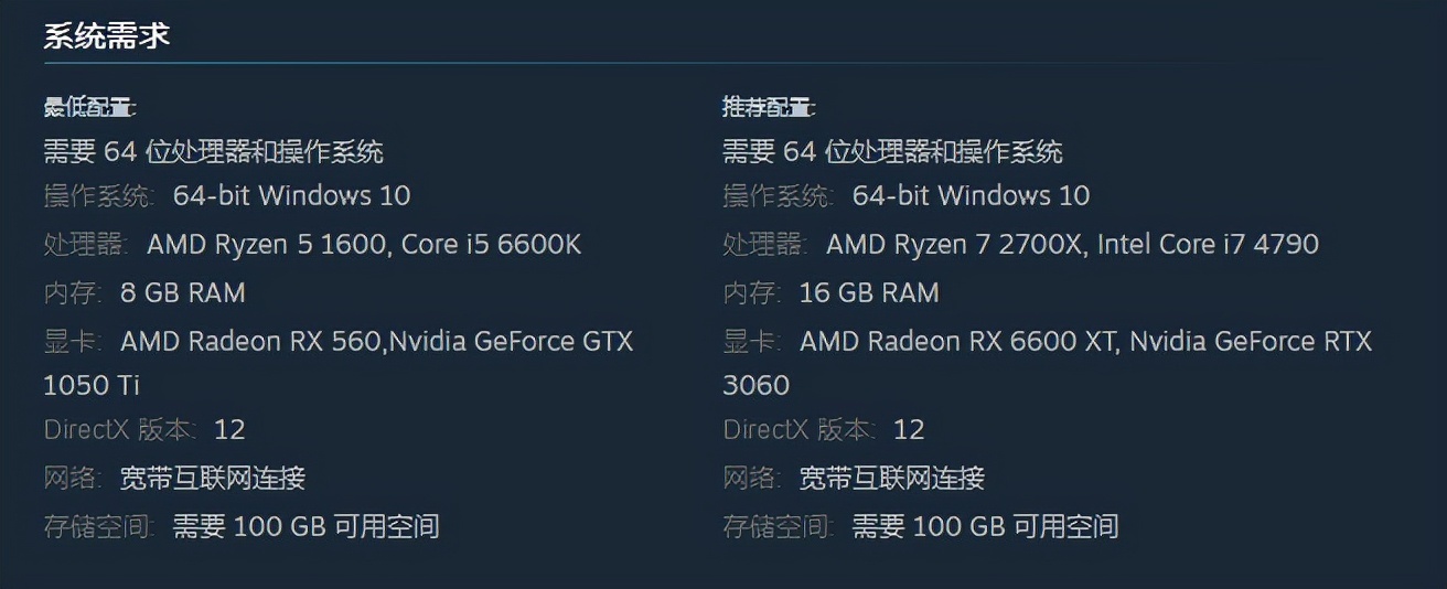在当下显卡价格居高不下的时代,看到《战地风云2042》这样的新作,玩家们最为关心地肯定是自己的配置能不能带得动的问题。就官方给出的的系统需求来说,这款游戏对于硬件的要求并不是太高。锐龙5 1600/酷睿i5 6600K处理器+8GB内存+RX 560/GTX 1050Ti即可满足游戏运行的最低需求。而推荐配置为锐龙7 2700X/酷睿i7 4790+16GB+RX 6600XT/RTX 3060,意味着当下主流的中端显卡就够用了。