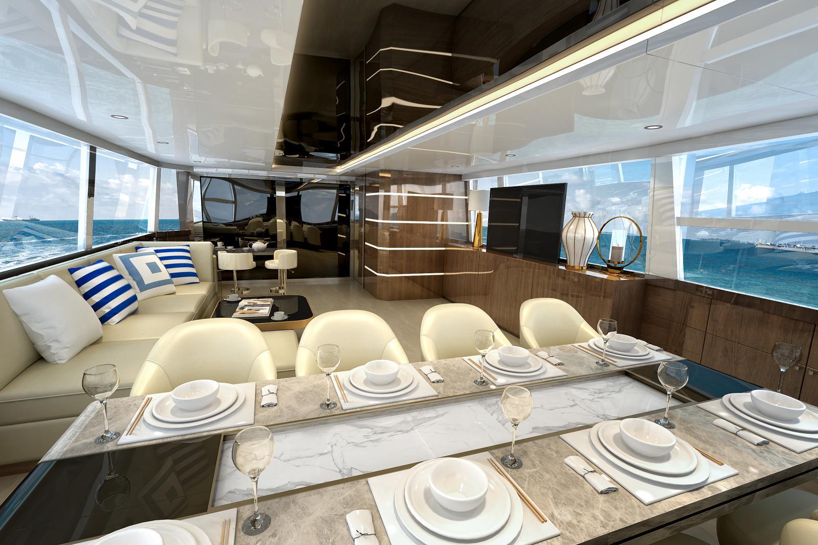 蒙帝菲诺游艇以精湛工艺打造的手工制造豪华游艇,运用了奢华的材质、先进的技术,针对客户不同的需求创造出无限可能的设计。蒙帝菲诺C45是非常独特的游艇船型,她双体船身设计,兼具动感、豪华、舒适、性能和低油耗。她优雅的线条和接近全景的大窗使室内采光充足,让人坐在里面心旷神怡。类似大型豪华游艇的设计,她开放式的座舱有很多座位和娱乐空间。