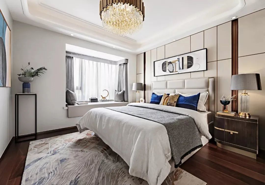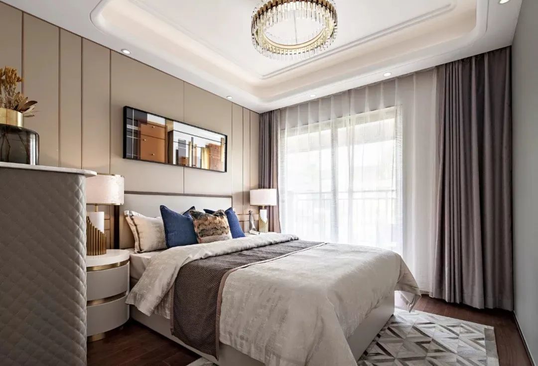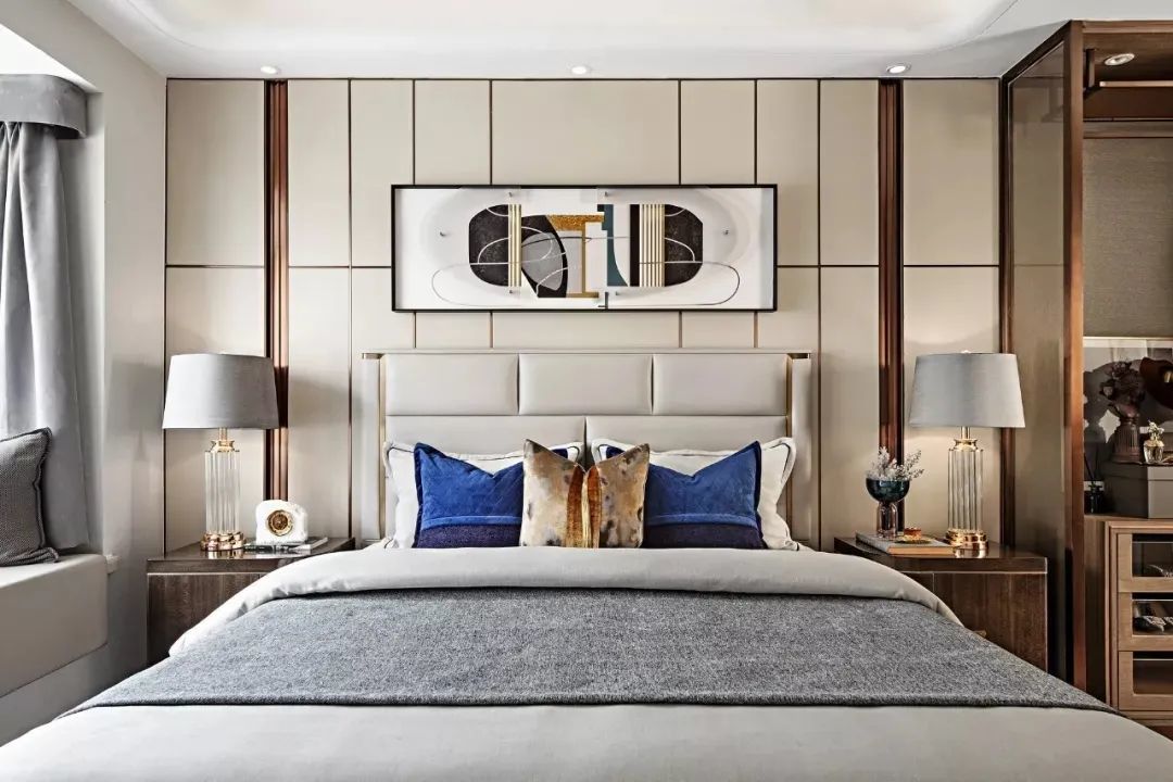 ▲卧室床头墙以米白色的硬包+金属条装饰,布置卡其色的皮艺床,灰白配的床单+蓝色枕头,床尾地面铺设色彩雅韵的地毯,也卧室空间显得安静优雅而温馨。