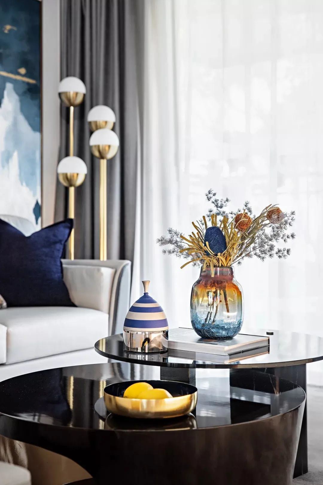 ▲黑色圆茶几给空间一种厚重端庄的感觉,摆上金属果盘、陶艺与彩色玻璃花瓶,也让空间显得更加精致有趣。
