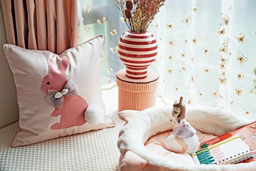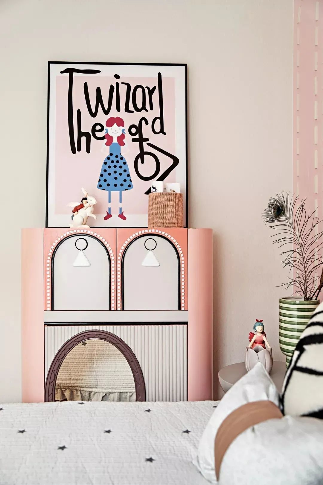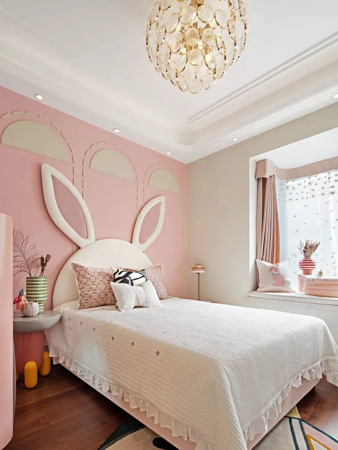 ▲儿童房整体粉色调的空间,床头靠背是一个可爱的兔子造型,营造出一种梦幻又可爱的设计氛围。细节处可爱精致的摆饰,也让空间显得更加灵活有趣。