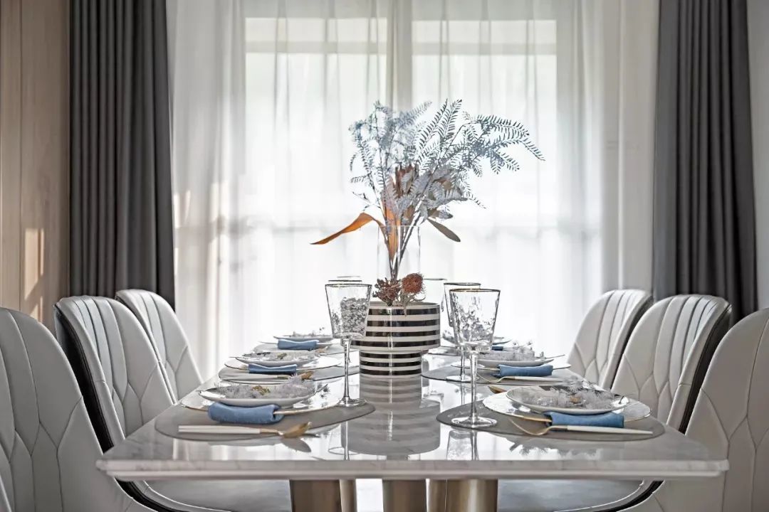 ▲雅白的石材餐桌上,摆上精致的餐具、高脚杯与花瓶,也让用餐更加情趣有仪式感。