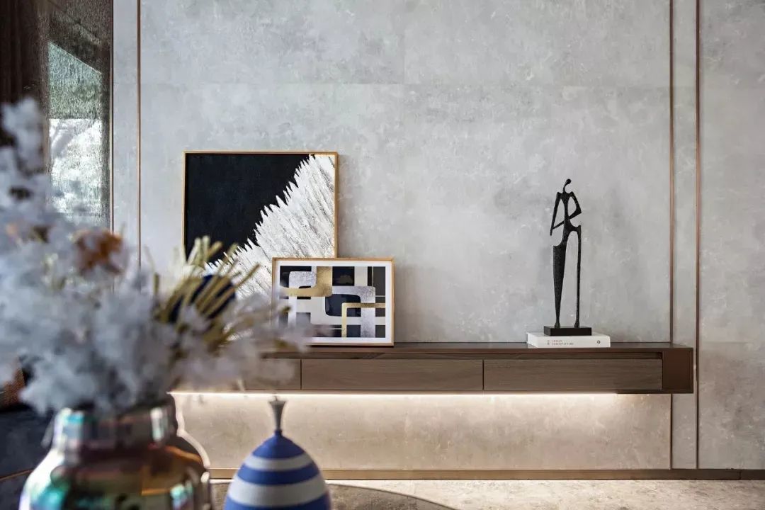 ▲岩板电视墙里加入金属装饰线条,装上一个悬空的木质电视柜,电视柜下加入暗藏灯带,台面上摆着黑白配的装饰画与极简线条造型的摆饰品,也让空间显得更加时尚而又艺术感。
