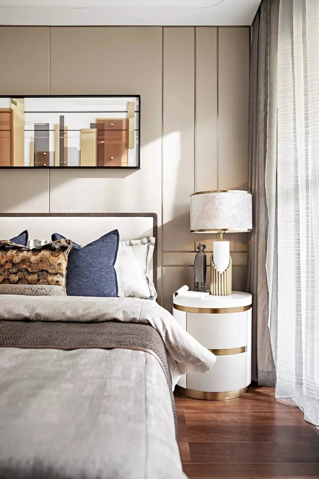 ▲次卧床头墙也是以暖灰色的硬包基础,挂上一幅横幅的装饰画,画面内容是橙-黄的方形几何图案,结合米灰色的床单,两侧圆柱形的床头柜布置,也让空间显得安静雅致。