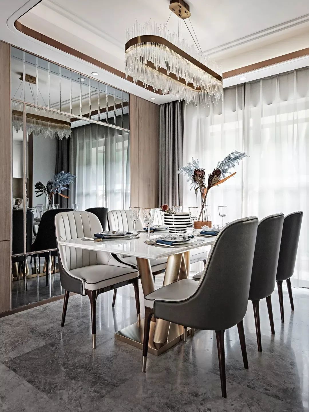 ▲餐厅背景墙以中间镜面+两侧木饰面,天花吊顶四周做了圆角+金属条的装饰,加入一盏华丽的水晶吊灯,也让空间显得更加高级大气。金属脚架+大理石台面的餐桌,搭配皮艺的餐椅,在镜面放大的空间感下,使得空间充满轻奢优雅的氛围感。