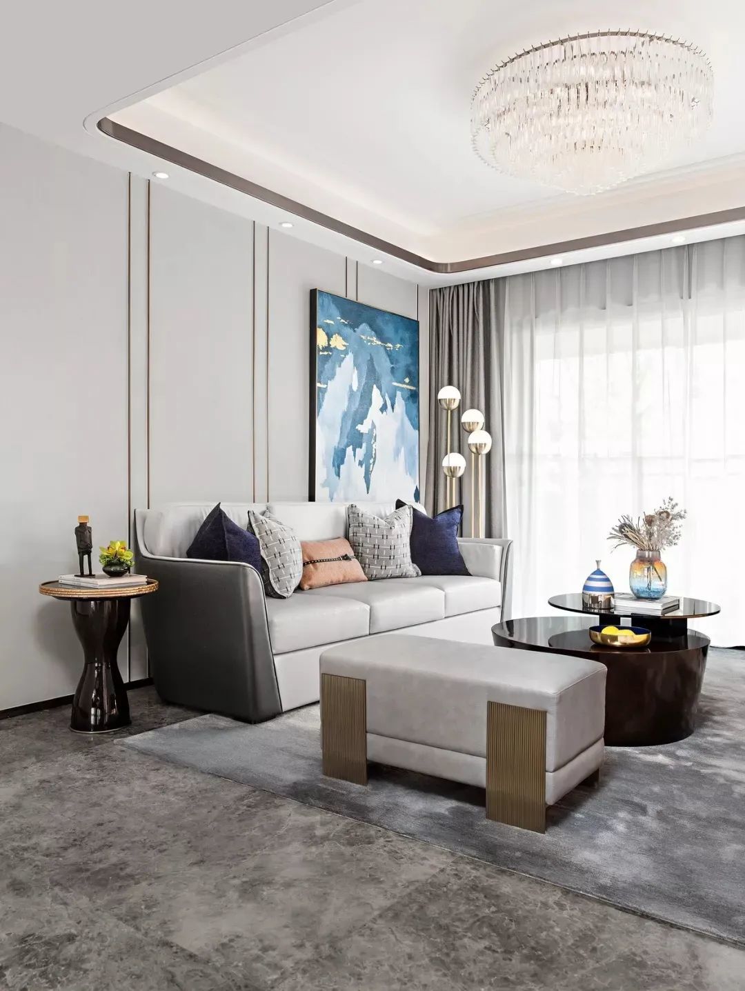 ▲沙发墙的灰色硬包中间也嵌入了金属条,挂上一幅蓝白色的装饰画,布置卡其灰的皮沙发,沙发两边加入边几与落地灯的布置,在低调文墨的空间下,也显得更加稳重优雅。