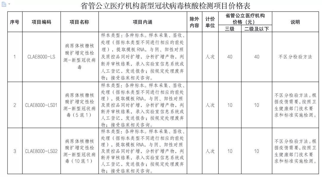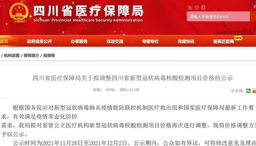 新京报快讯 据四川发布微信公众号消息,从四川省医疗保障局了解到,根据国务院应对新型冠状病毒肺炎疫情联防联控机制医疗救治组和国家医疗保障局最新工作要求,有效满足疫情常态化防控需求,四川拟再次下调省管公立医疗机构新冠核酸检测项目价格,单检40元/人次,混检(5混1、10混1)10元/人次。