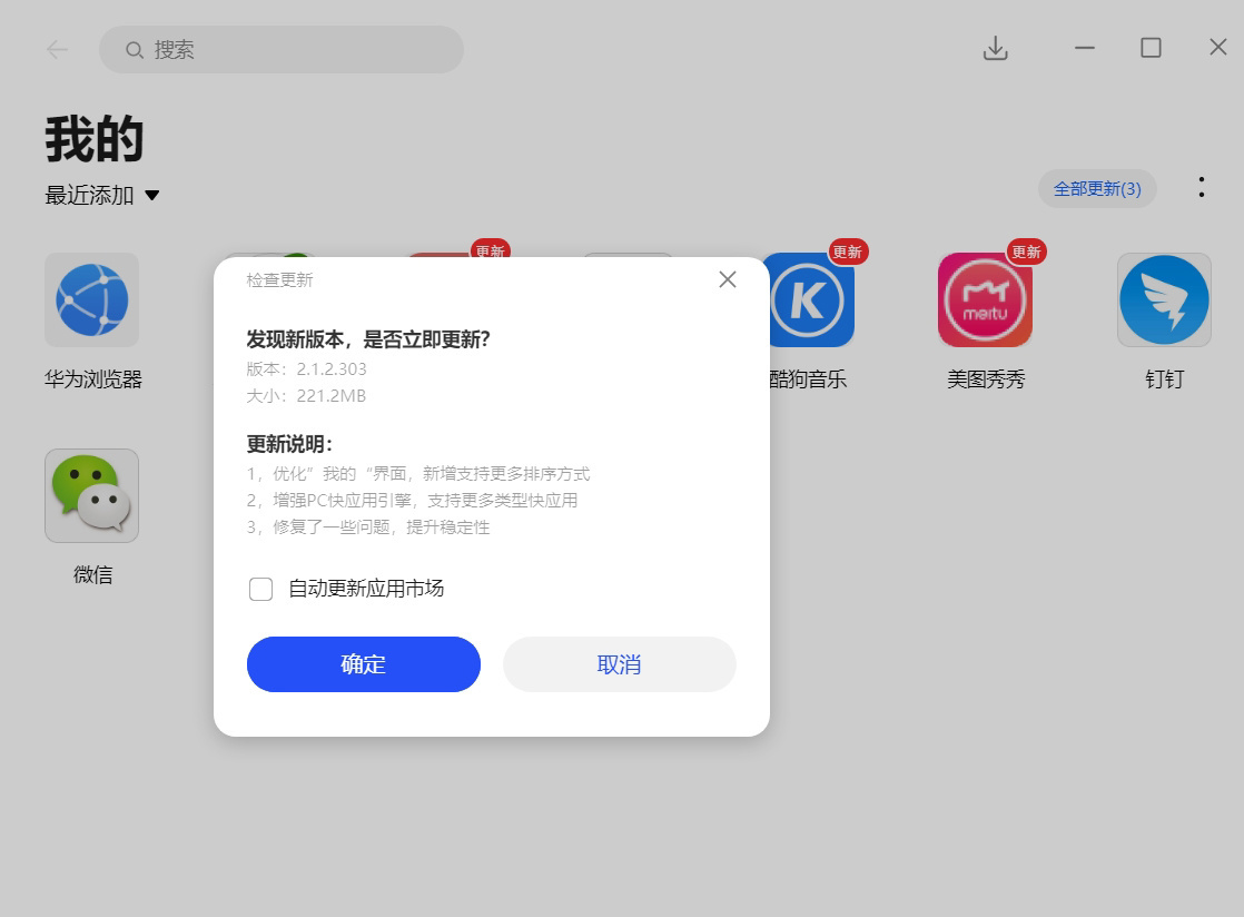IT之家 11 月 27 日消息,近期,华为应用市场 PC 版迎来了 2.1.2.303 更新,下载包大小为 221.2MB,带来了功能优化和一系列的修复。另外该应用程序也支持自动更新。