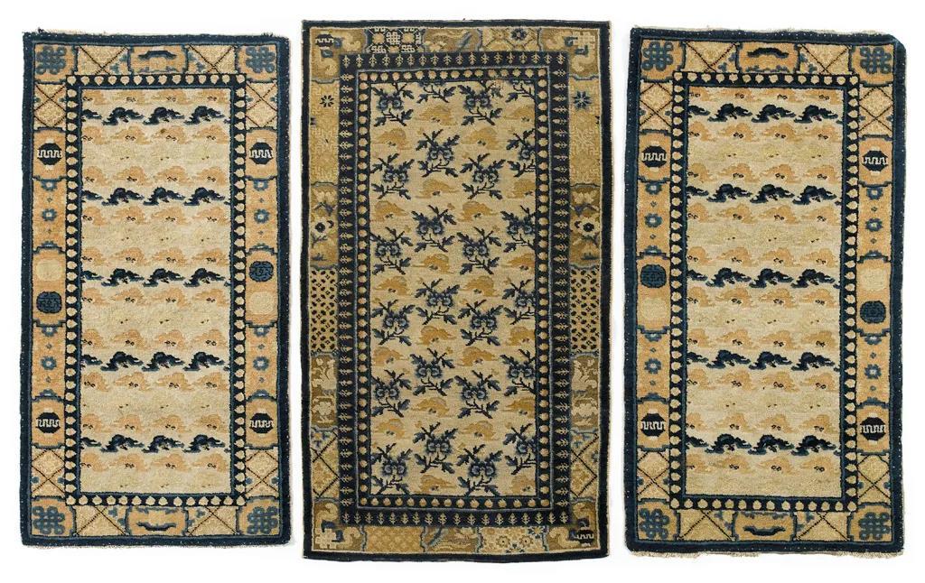同时也有与其他地区相似的,以中心夔、角隅、边框组成的“十”字格律体构图,如散花式、浪花式等,尤其是新疆因丝绸之路交通要道的天然优势,不断吸收东西方地毯文化而增加的新疆地毯样式,如博古式的自由散点构图、美术式的晕色立体效果、波斯式的连续性软花细密组织等,也多为此类布局。