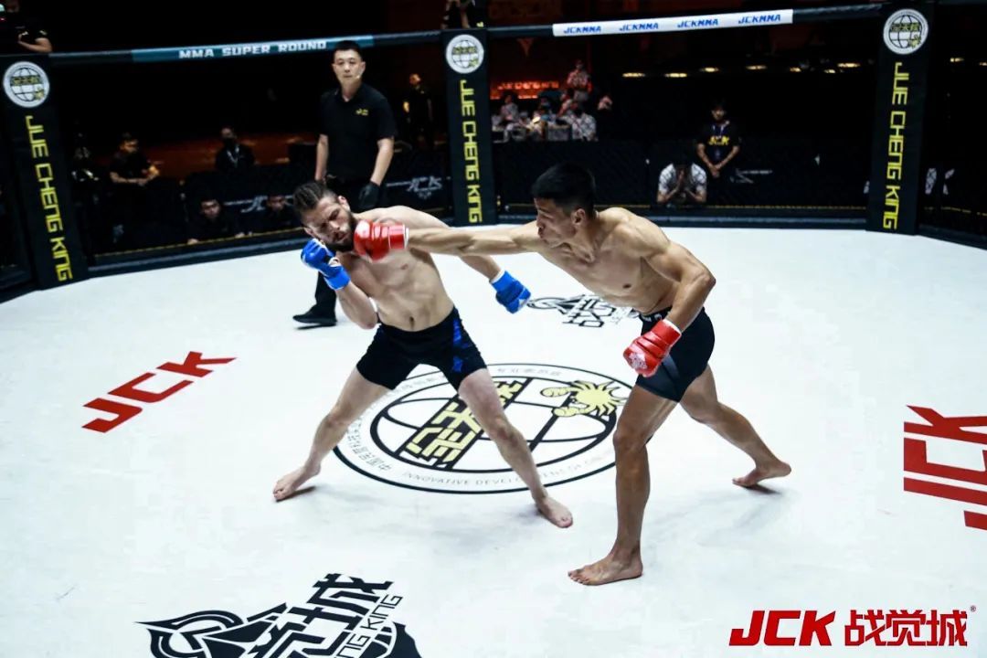 历乘与JCK战觉城次中量级TOP英雄榜排名第九,敖日格乐JCK战觉城次中量级TOP英雄榜排名第八,两位选手都有着极强的终结能力。比赛开局,二人相互试探,进攻激烈。敖日格乐一个后手拳将对手击倒在地,并抓住时机疯狂输出,有效打击率高达83%,使对方毫无反击之力,仅用55秒便TKO获胜。