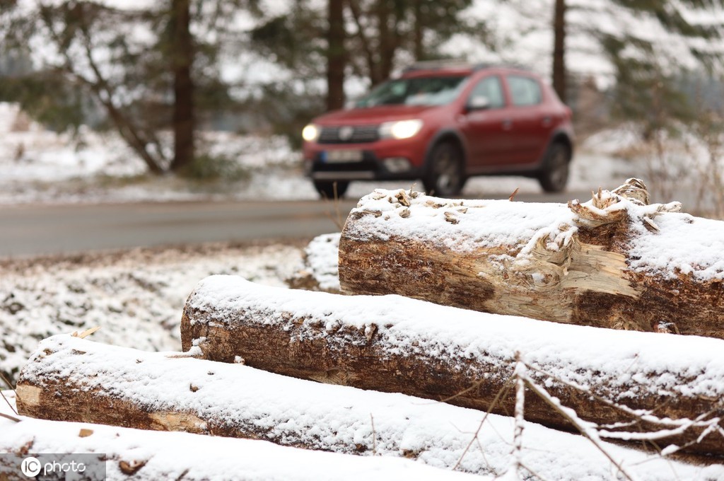 当地时间2021年11月27日,德国萨克森-安哈尔特,汽车驶过哈尔茨山区积雪覆盖的树干。在未来的几天里,雪线还会继续下降,低地地区也将下雪。